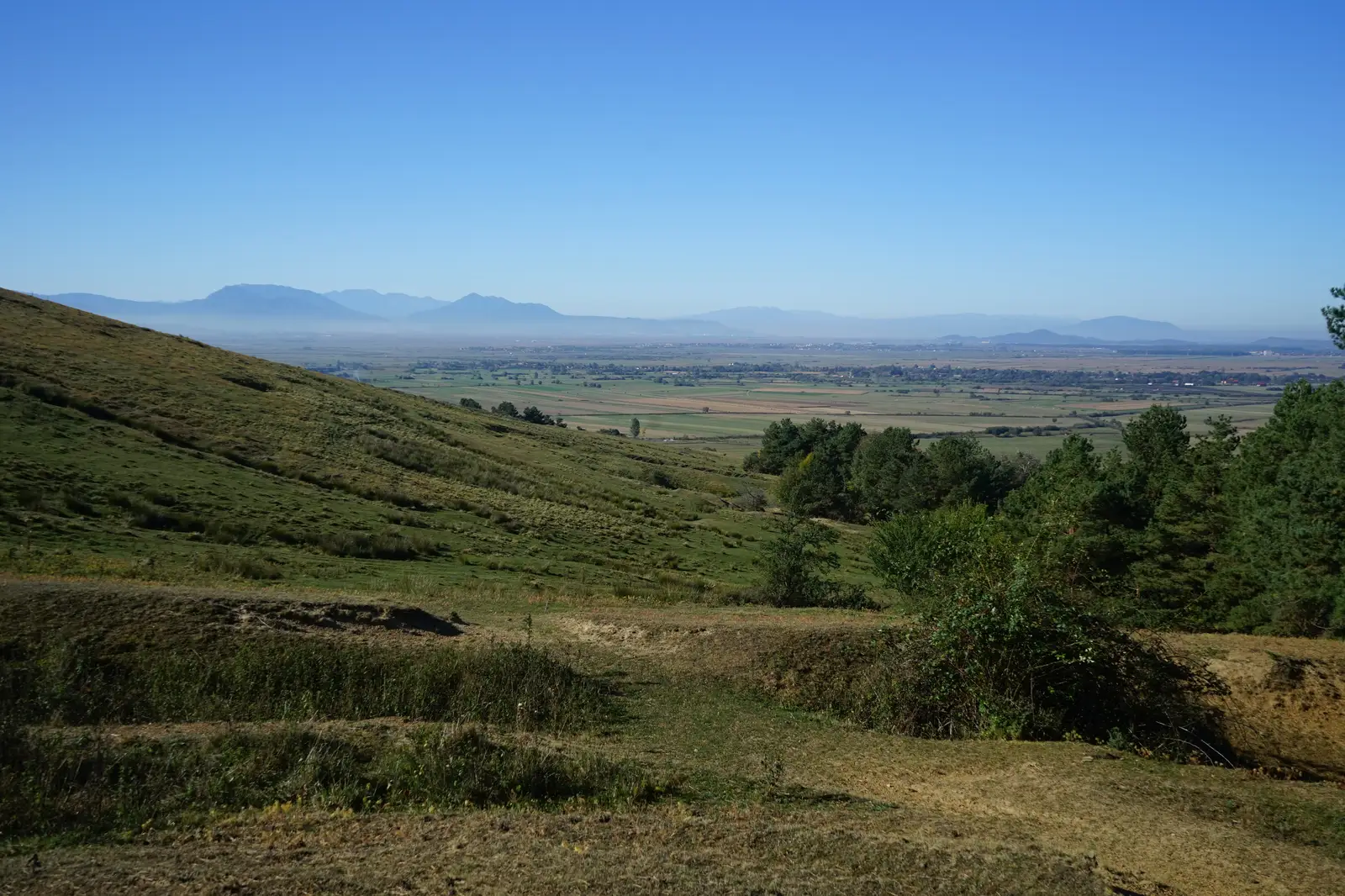 De la banca şi masa de deasupra Pensiunii Mókus, unde putem ajunge urmărind traseul TG, urmărim tabla de direcţie marcată cu PG spre SV. Păstrând aproximativ acelaşi nivel de altitudine, traversăm două păşuni, iar după 320 m, ieşind de după nişte arbori într-o păşune mare, cotim spre deal spre stânga (S), urmărind linia dintre copaci şi păşune. Urmărim această linie pe un drum de căruţă, urcând constant până pe Dealul Hebea, la jumătatea acestui urcuş întâlnind un loc de popas cu o bancă, oferind o panoramă superbă asupra Ţării Bârsei. Acest traseu oferă o privelişte mai panoramică decât traseul TG.