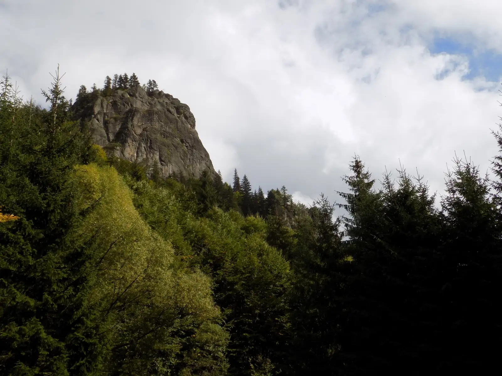 Continuăm printre stânci răzlețe, apoi trecem prin spatele unei stânci numite Biserica Frăsinetanilor sau Pietrocul cu Cruce și ajungem la cantonul silvic de pe Valea Cetății (capătul drumului Scrind - Frăsinet), aflat la baza stâncii.