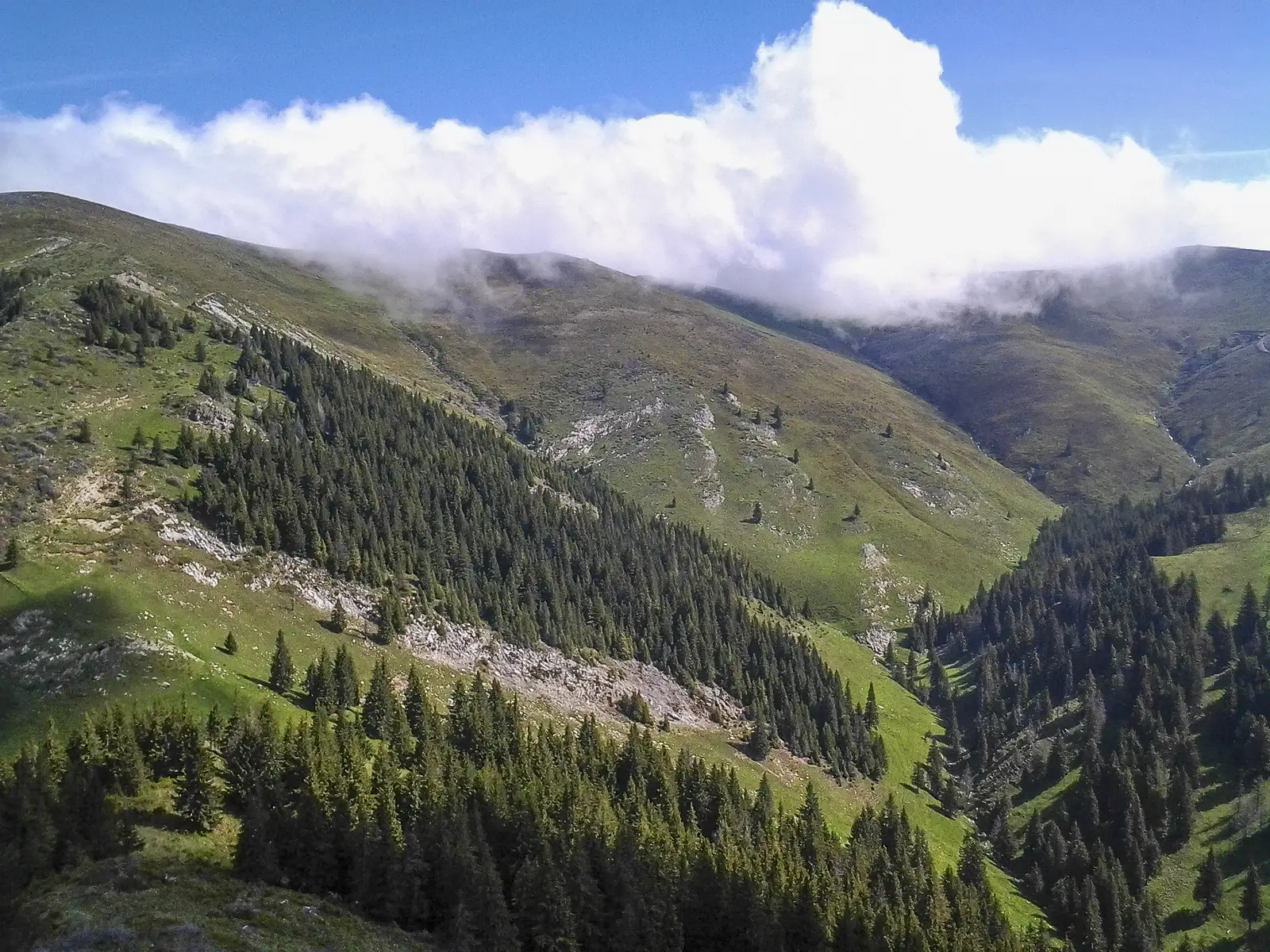 Poteca CR depășește o şa cu o poiană, punct de belvedere cu perspective frumoase spre culmile ce se desprind din creasta principală și continuă pe coama Muntelui Zănoaga până la intersecţia cu creasta principală (traseul 1), care apare mai stâncoasă decât coama domoală pe care am urcat. Intersectăm creasta principală (1780 m), în preajma Vf. Chica Fedeleşului. Efortul depus este răsplătit de perspectiva asupra văilor înconjurătoare și asupra vârfurilor ce câștigă altitudine până spre Vârful Suru.