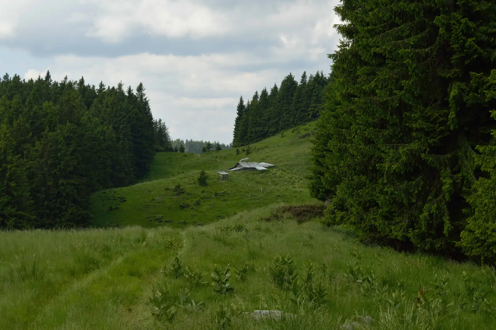 Traseul porneşte de la podul de peste râul Zăbala, aflat la câţiva metri amonte de stâncile săpate de apă cunoscute sub denumirea de Căldările Zăbalei. Urmează drumul forestier bifurcat la stânga, depăşeşte clădirile unor unităţi silvice şi pătrunde în bazinul văii Zârna Mică, folosind în exclusivitate versantul stâng al acesteia, până la interceptarea Pârâul Verde (cale de 4,7 kilometri). De la traversarea albiei continuă 2,6 kilometri pe direcţia generală est şi ajunge în Şaua Furu, în apropierea Stânei lui Coman (aflată în paragină). Din acest loc, continuă 1,3 kilometri pe curbă de nivel prin poiana de sub Vârful Furu Mare şi intră în pădure prin stânga unei stâne. De la intrarea în pădure, pentru ultimii 10,4 kilometri, utilizează drumuri forestiere şi apoi un drum comunal pietruit pentru a ajunge în staţia de autobuz aflată la intrarea sudică a comunei Vintileasca.