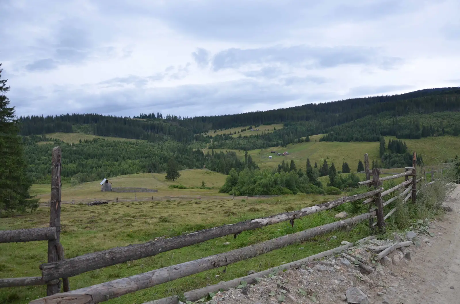 În Șaua La Cruce părăsim culmea Obcina Mestecănişului spre SE, coborând scurt (easy downhill)spre o exploatare de piatră, de la care urmăm domol Valea Stânii până la şoseaua principală, la aprox. 6,5 km aval de punctul de pornire (comuna Cârlibaba).