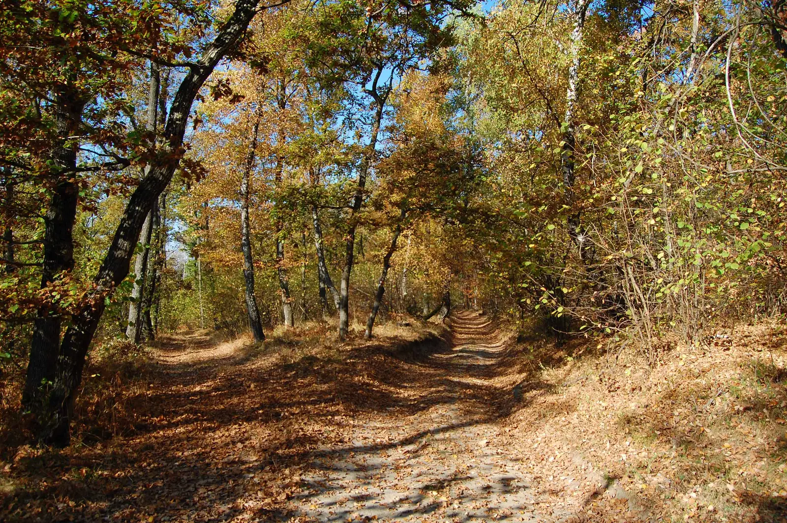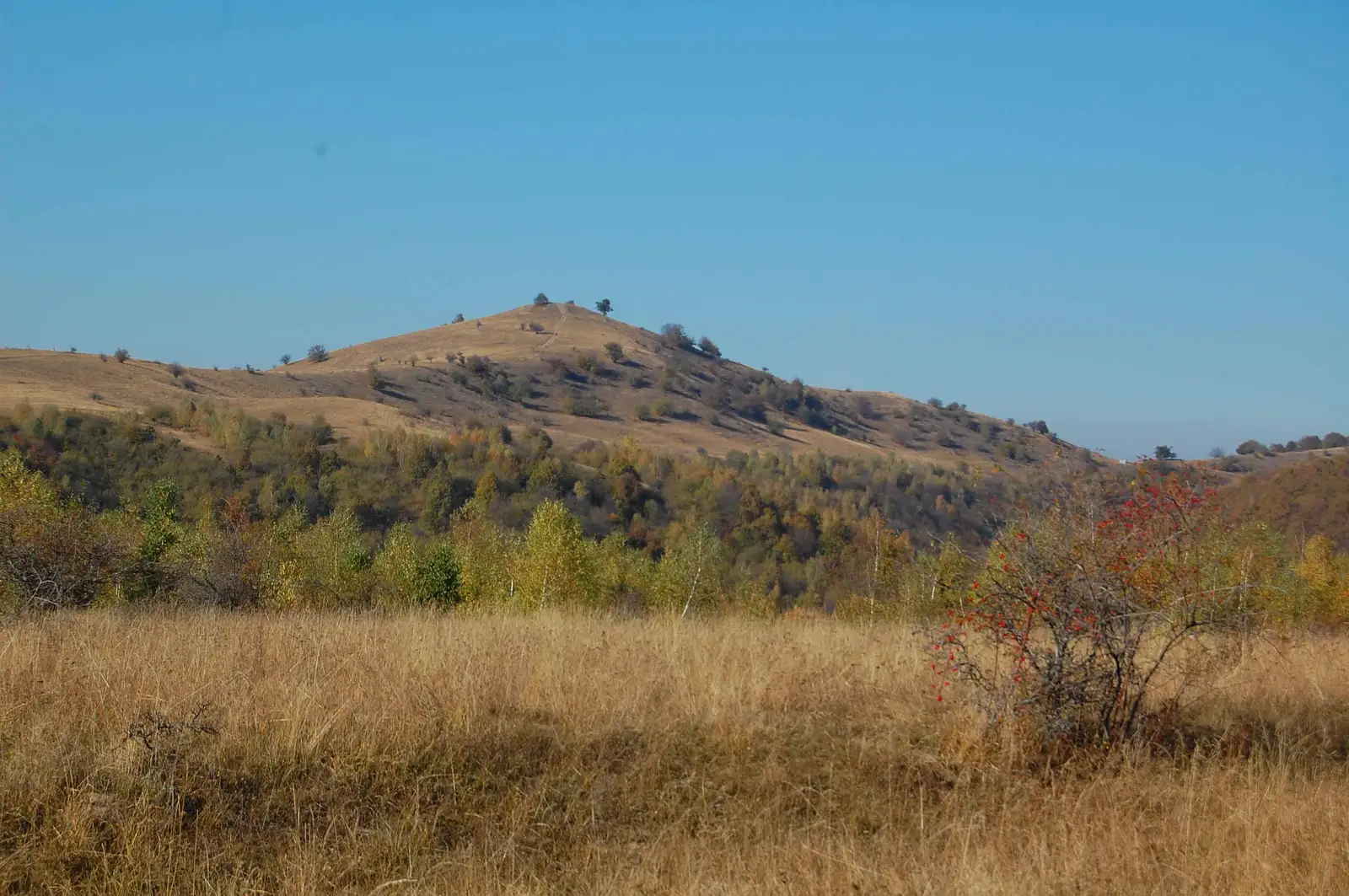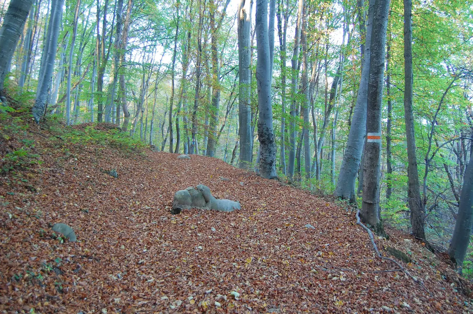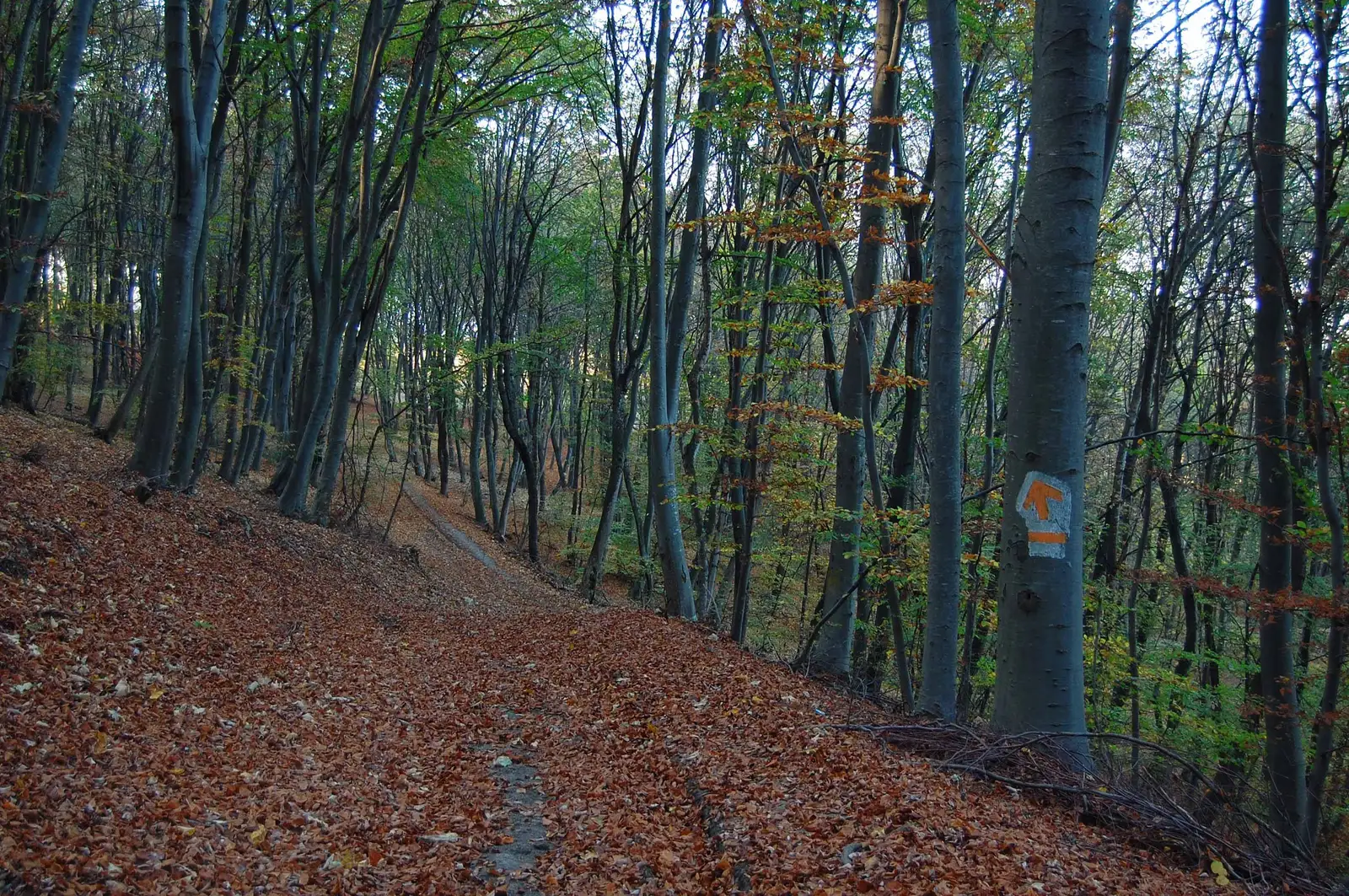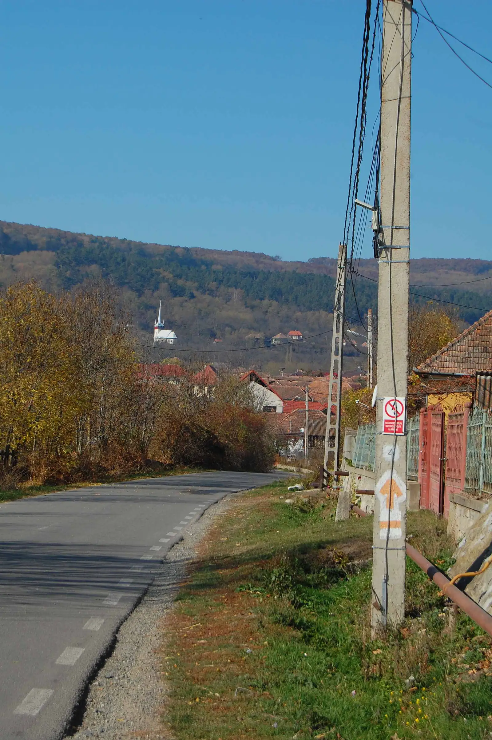 Aici lăsăm la stânga poteca de legătură cu BR, marcată BA (traseul 15), ținem drumul principal pe lângă pensiune, apoi urcăm pe un drumeag la stânga, în pădure, aproape de un pârâu, traversăm valea și ieșim în culmea dealului, unde regăsim marcajele BR.
