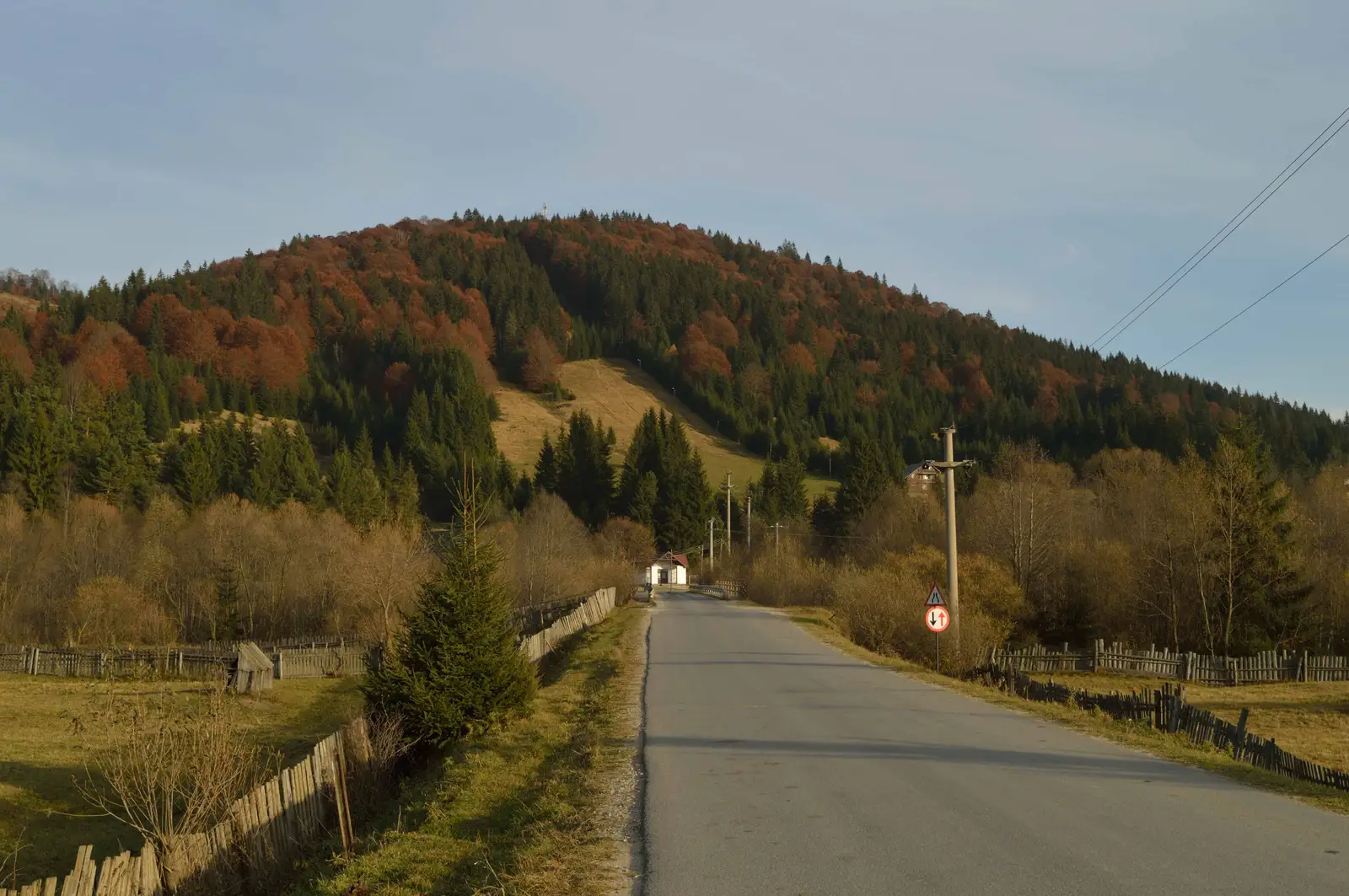 Traseul începe din dreptul unui hambar de lemn. Traversează mai întâi şinele de cale ferată forestieră (de-a lungul cărora este marcat traseul TG), după care înaintează pe drumul pietruit ce trece pe lângă cimitirul din localitate şi pe lângă un rezervor metalic. După alţi 50 metri intră în pădure. Marcajul merge de-a lungul unui forestier bine conturat, cu exepţia unei porţiuni de aproximativ 150 metri în care poteca scurtează distanţa până la vârf prin pădure, revenind apoi în drumul forestier. De aici se continuă urcarea pe drum până la următoarea bifurcaţie, unde alegând calea din partea dreaptă ajungem pe Vârful Laur, la baza releului de telecomunicaţii amplasat aici.