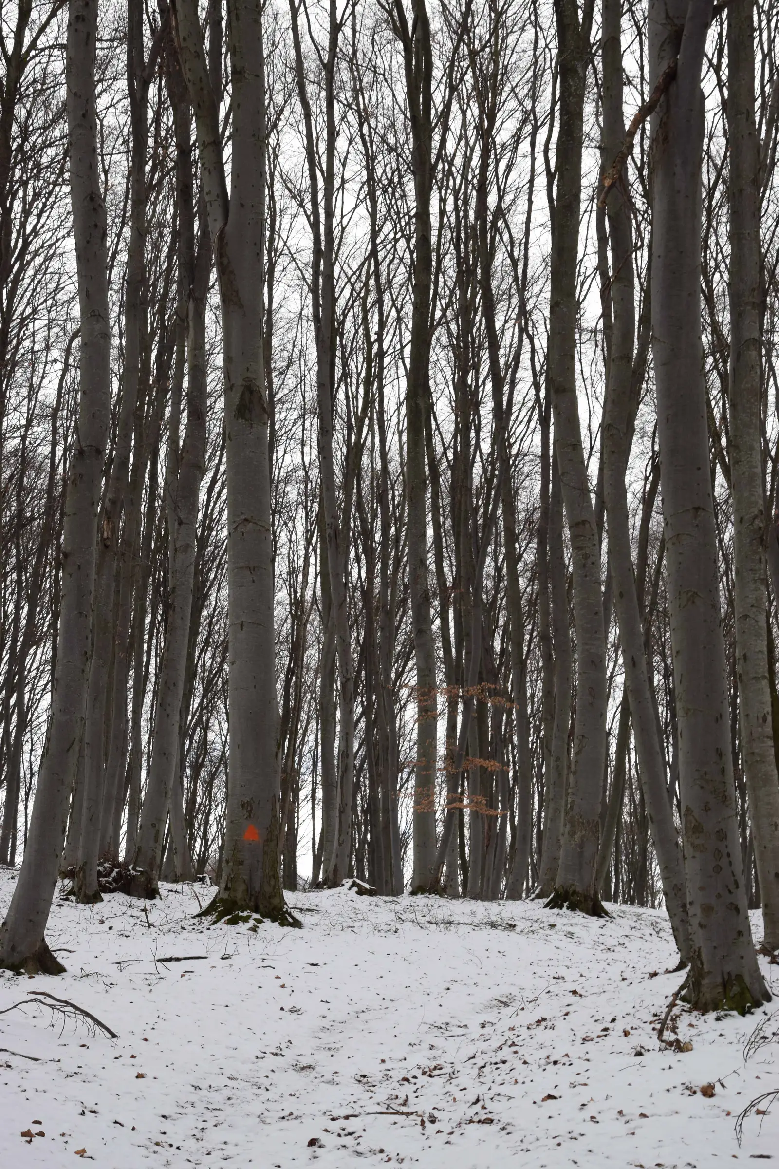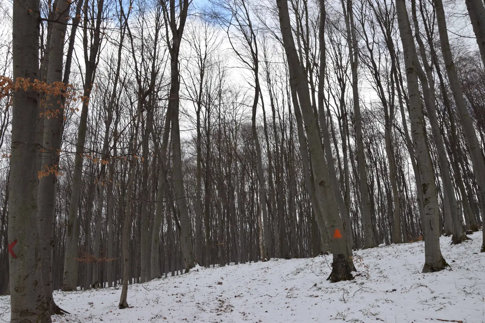 Din Drumul Sălicei, lângă o troiță și panoul de limită a Comunei Ciurila, intrăm în pădure pe o potecă largă cu marcaje nestandard - Triunghi Portocaliu fără fond alb. Poteca traversează rând pe rând traseele consacrate spre vârful Peana, respectiv CA (traseul 3), CR (traseul 4) și traseul principal BA (traseul 2). Un parcurs aproximativ pe curbă de nivel, în direcția Izv. Dr Bilașcu, traversând rezervația Făgetul Clujului.