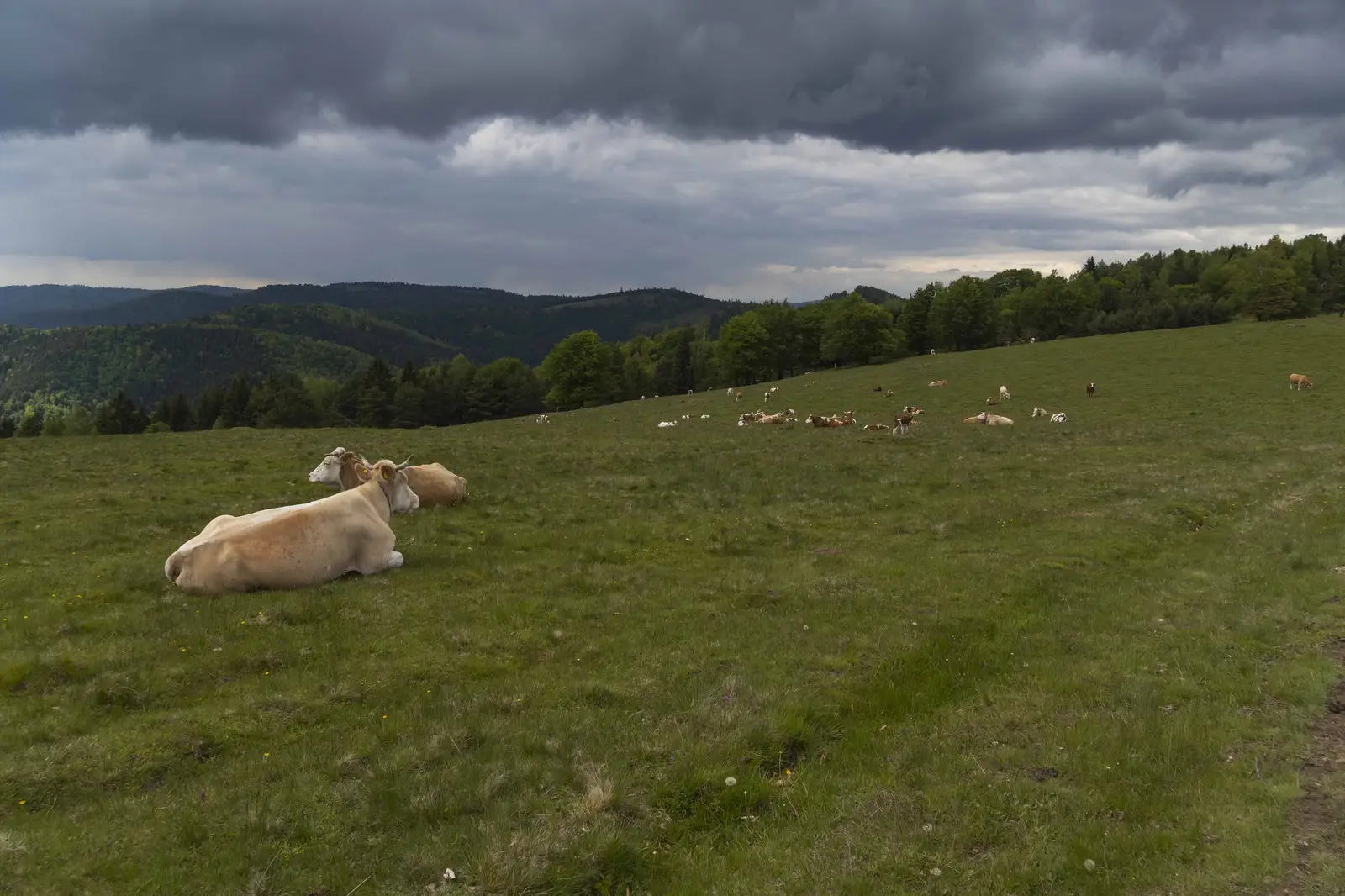 Începem să urcăm uşor pe poteca care urmărește un drum de căruță vizibilitate spre zona înaltă a Munţilor Nemira, drum care ne conduce la pășunea mare (cu stână) a Vârfului Carhago. Pădurile coboară pe pantele culmii până la valea Râului Negru.