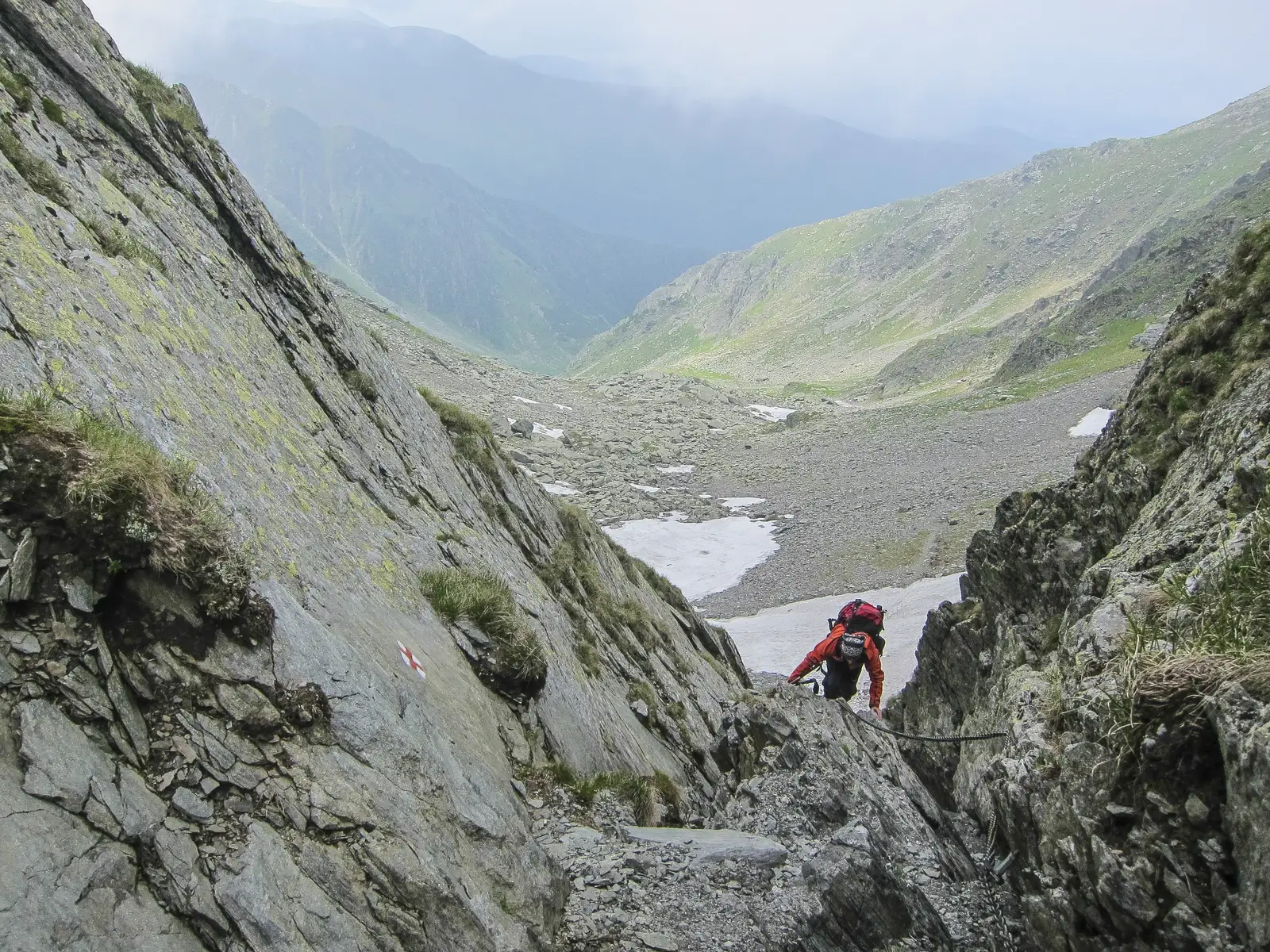 Depășim un sector de stâncării ce necesită atenție sporită când poteca e udă, în primă fază printr-o zonă amenajată cu lanțuri, apoi pe poteca abruptă ce trece pe sub versantul nordic al Vârfului Negoiu Mic şi Negoiu (2.535 m). Traversăm apoi o zonă de morenă, ocolind pe la nord Creasta Fierăstrăului, într-o zonă unde poteca necesită atenție sporită. Ajungem pe prispa Căldării de la Strunga Dracului, cu o perspectivă largă împrejur.
