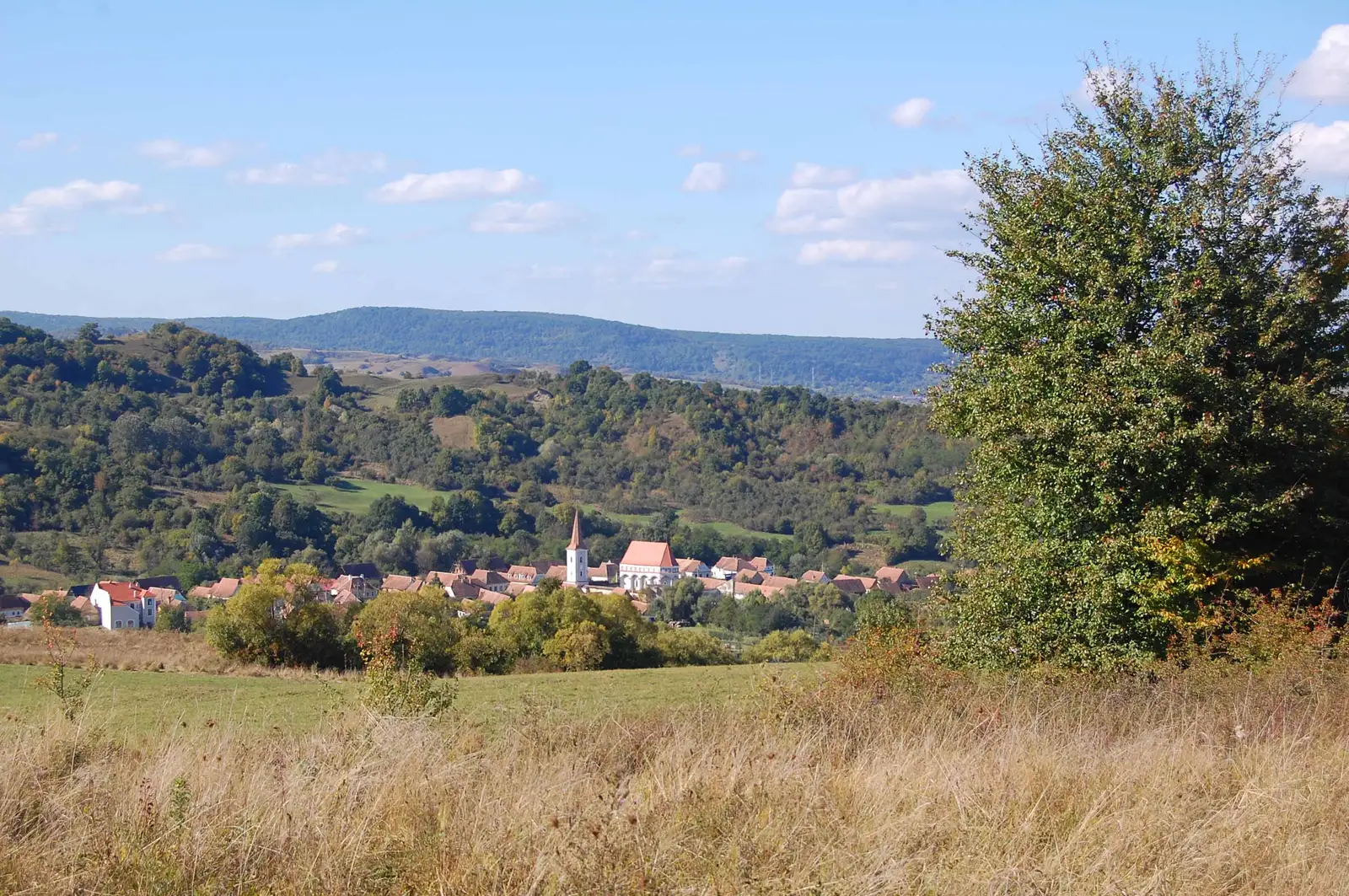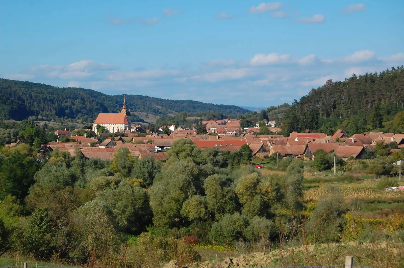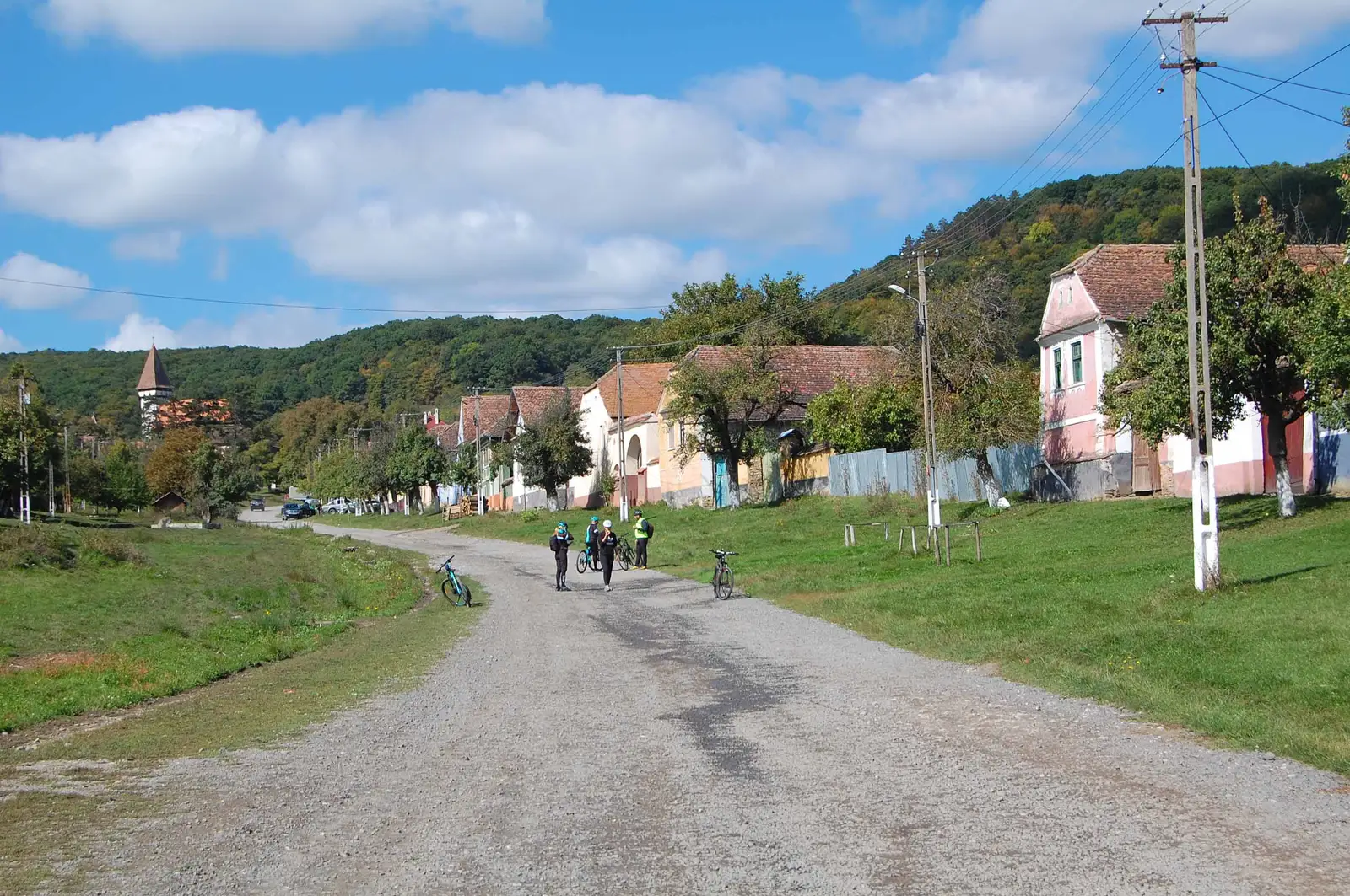 Traseul foloseşte unele din rutele concursului TBT Race. Urcăm pe deal, trecem pe la Cetatea Țărănească, apoi urmăm un parcurs prin pădure, în general aproape de culmea dealului. Ieşim la o intersecţie importantă de trasee. De aici intrăm pe poteca specială de biciclete, pietruită şi marcată cu BR, ce leagă Sighişoara de Viscri. Urmăm această potecă - pe care e o plăcere să pedalezi - cale de 5,7km preponderent prin pădure, apoi marcajul BR foloseşte un drum forestier pietruit 1,4 km, apoi din nou urmăm poteca aproape 6 km până la un indicator de lemn cu satele în care putem coborî. Aici sunt două variante - prima este să continu ăm spre Viscri încă 250m, apoi să coborâm în Meşendorf folosind un drum marcat cu CR. A doua variantă este să urmăm marcajele de concurs şi să ţinem culmea secundară (interfl uviul dintre Valea Daia şi Valea Morii) pentru o coborâre directă la Criţ. Atenţie, concursul coboară la Meşendorf, apoi urcă din nou pe culmea precizată, folosind o potecă în serpentine pietruită. Urmăm deci această potecă spre Criţ, însă pe ultima porţiune (la păşune) este neclară, aşa că folosim un drum de pământ şi coborâm la marginea satului Criţ. Străbatem localitatea, trecem dealul la Cloaşterf, de unde ne întoarcem la Saschiz pe DC53C asfaltat.