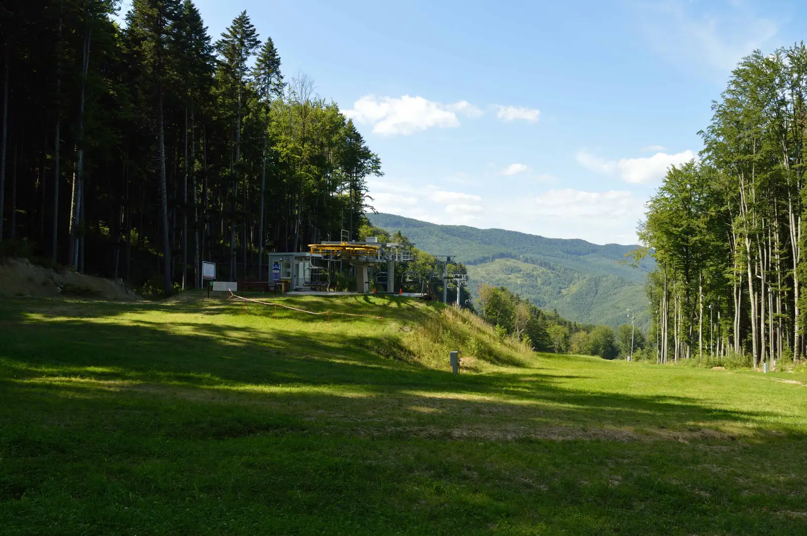 Nu după mult timp, ajungem în cel mai înalt punct de pe traseu, situat într-o șa care desparte vârful Cerbului de culmile estice. Suntem la 795 m alt. și de aici coborâm spre punctul terminus al pârtiei de schi Nemira. Facem o scurtă pauză în care admirăm panorama cu munții din jur, apoi coborâm pe partea dreaptă a pârtiei până la baza acesteia.