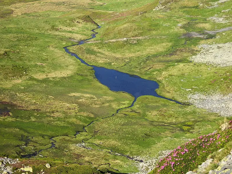 BG continuă la marginea pădurii, ajunge la o poiană cu două doline inundate pitorești (între care și Lacul din Dolina Neagră) și intră din nou în pădurea cu muşchi, tufe de afine și pârâiaşe, specifică zonei Padișului, de care ne apropiem pe curbă de nivel, traversând Valea Cuciulata. Aici marcajele sunt aplicate pe pietre şi trebuie să fim atenţi la orientare.