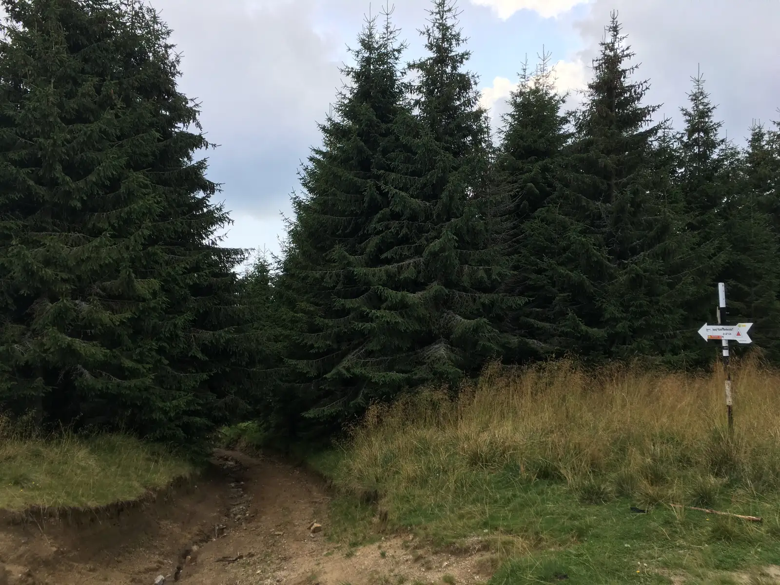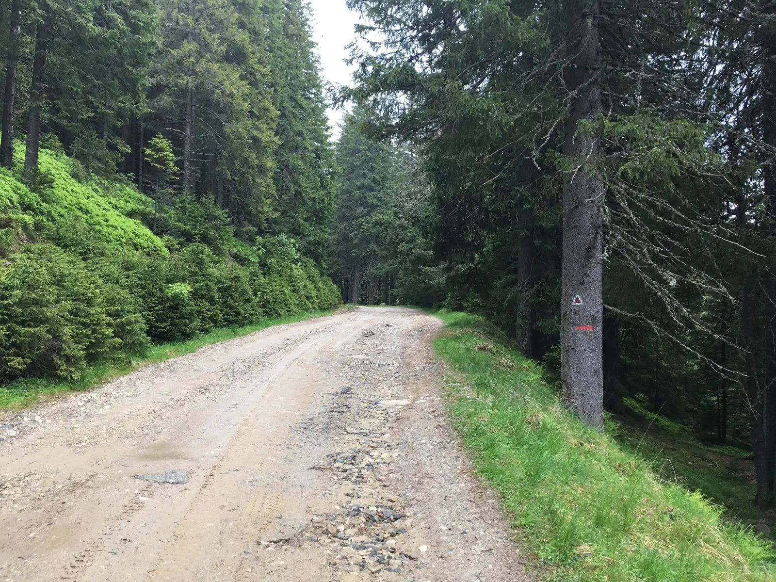 TR continuă prin pădure, trece de firele pârâului Bătrâna Mică și de poiana omonimă, traversează un drum neasfaltat, după care coboară ușor prin pădure, spre dreapta. După ce traversăm o poiană cu izvor și sol mocirlos, urcăm pe panta vestică a muntelui La Pahar, sub vârful aflat la stânga (1439 m).