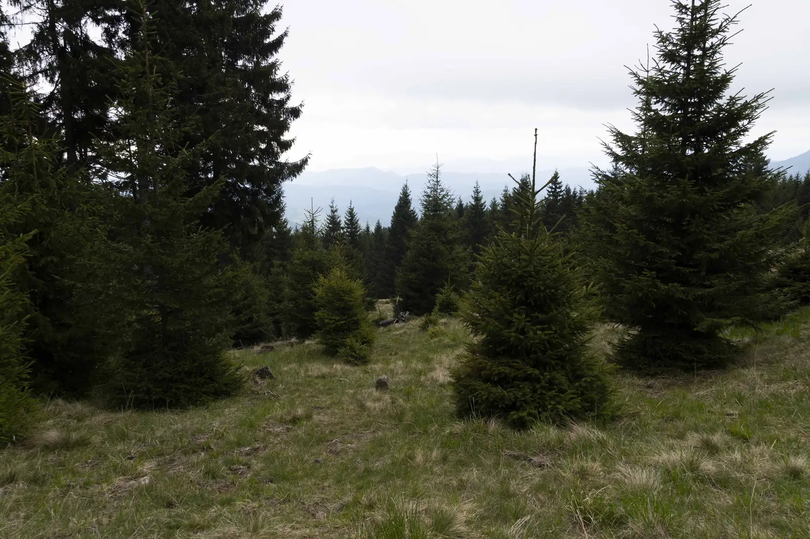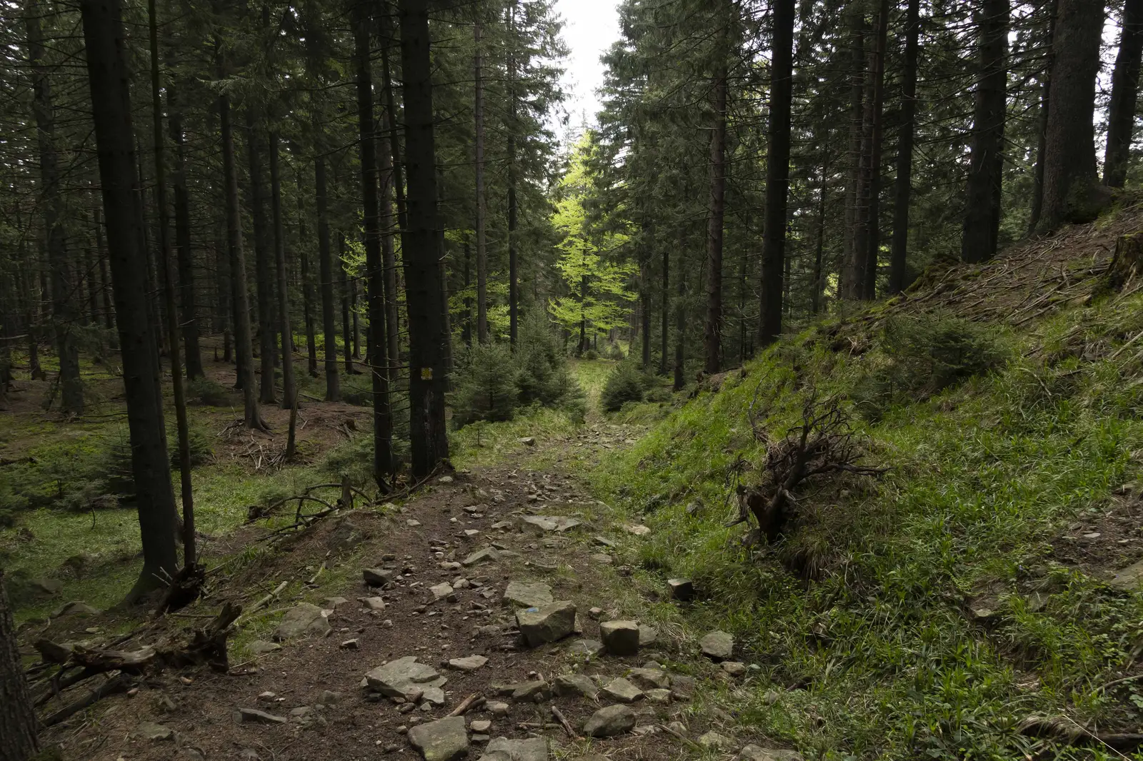 De pe creasta vârfului Nemira Mare, coborâm pe o potecă ce urmează culmea secundară “Plaiul Ciungetului”, până la intesercția cu BG (traseul 3) - care urcă dinspre zona “La Argintărie” și coboară pe culme spre “Lacul Bălătău”. Traseul coboară prin câteva poieni, apoi intră în pădure și ține un drum de exploatare.