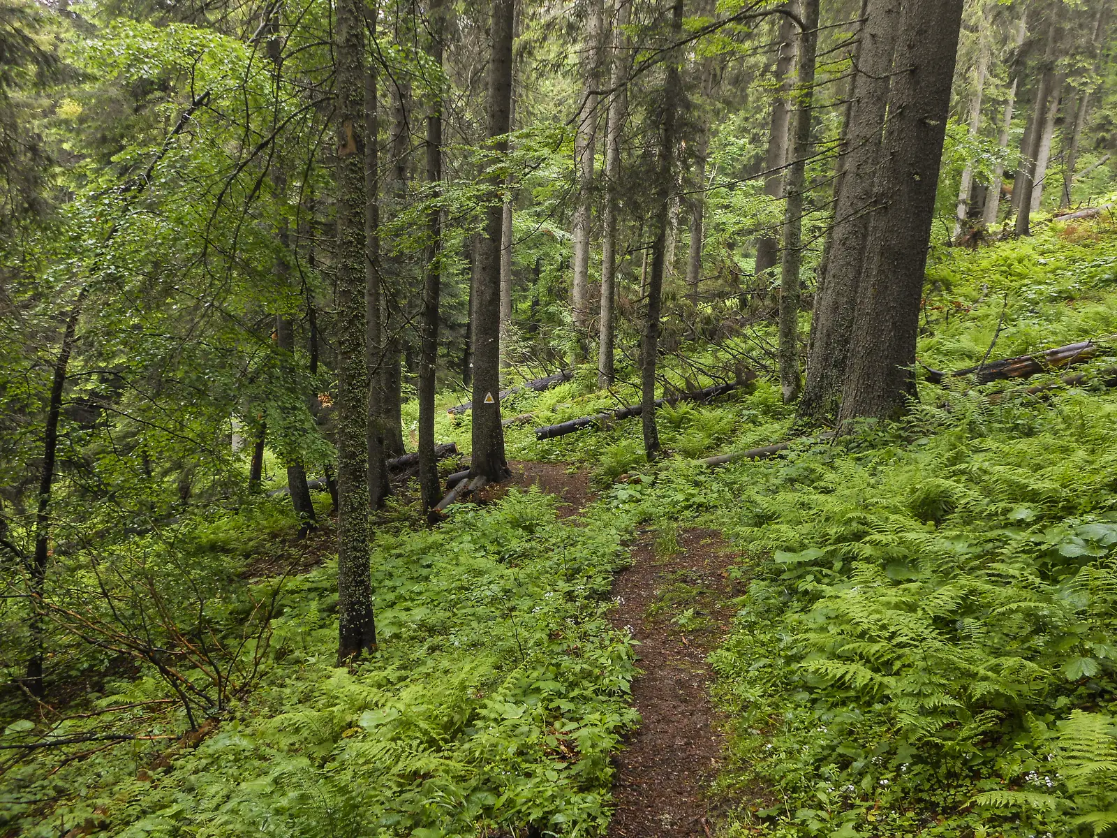Continuăm în urcare lină pe culme până la lacul artificial din Poiana Ruia, pe care îl ocolim pe partea stângă (din amonte) și ajungem la stâlpul de telescaun Ruia. Pentru a continua până la Cabana Postăvaru, vom urma traseele BG și BA, care traversează pârtia.