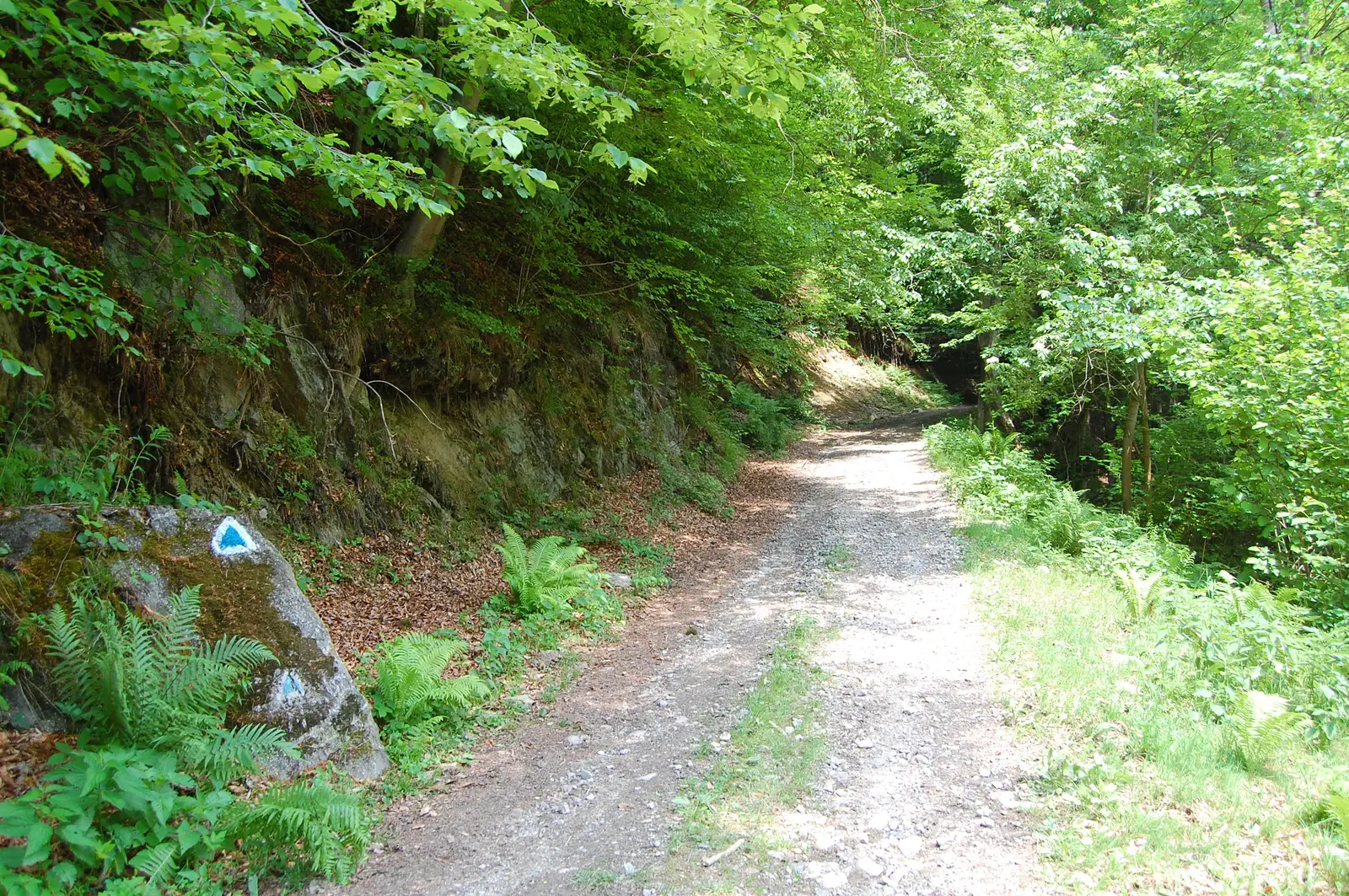 Traseul se desprinde din drumul asfaltat DJ705A la circa 50 m în aval de borna kilometrică 14 şi urcă la început pe un drum în serpentine. Semnele sunt rare, dar urmărind drumul ajungem în culme, unde întâlnim mai multe gospodării. Aici cotim spre dreapta (Est), drumul trece pe lângă mai multe case, troiţe şi fânaţe, peisajul este pitoresc. La ultima casă drumul care ne-a adus aici se termină, dar marcajul străbate curtea casei şi apucă pe o potecă tăiată în coasta muntelui. După 350 m intrăm în pădure unde continuăm în aceeaşi manieră trecând mai multe pâraie. Întâlnim cetatea, ascunsă în pădure şi nesemnalizată de nici un panou informativ. Continuăm parcursul în aceeaşi direcţie pe poteca tăiată în munte, traversăm încă un pârâu puternic, iar la final coborâm abrupt la DJ705A în vecinătatea bornei kilometrice 17 km+200 m, lângă un pârâu cu o amenajare pentru apă de băut.