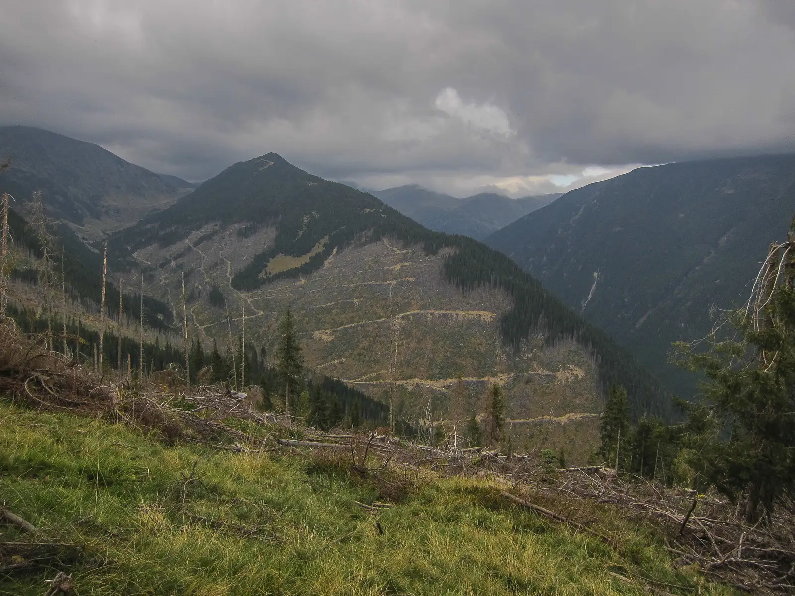 În apropiere de fostul lac de acumulare Balta Pojarnei, găsim un drum forestier spre stânga, care urcă într-o zonă haotică rămasă în urma unei exploatări forestiere agresive, un tablou dezolant cu mai multe muchii complet defrișate și o reţea de drumuri forestiere.
