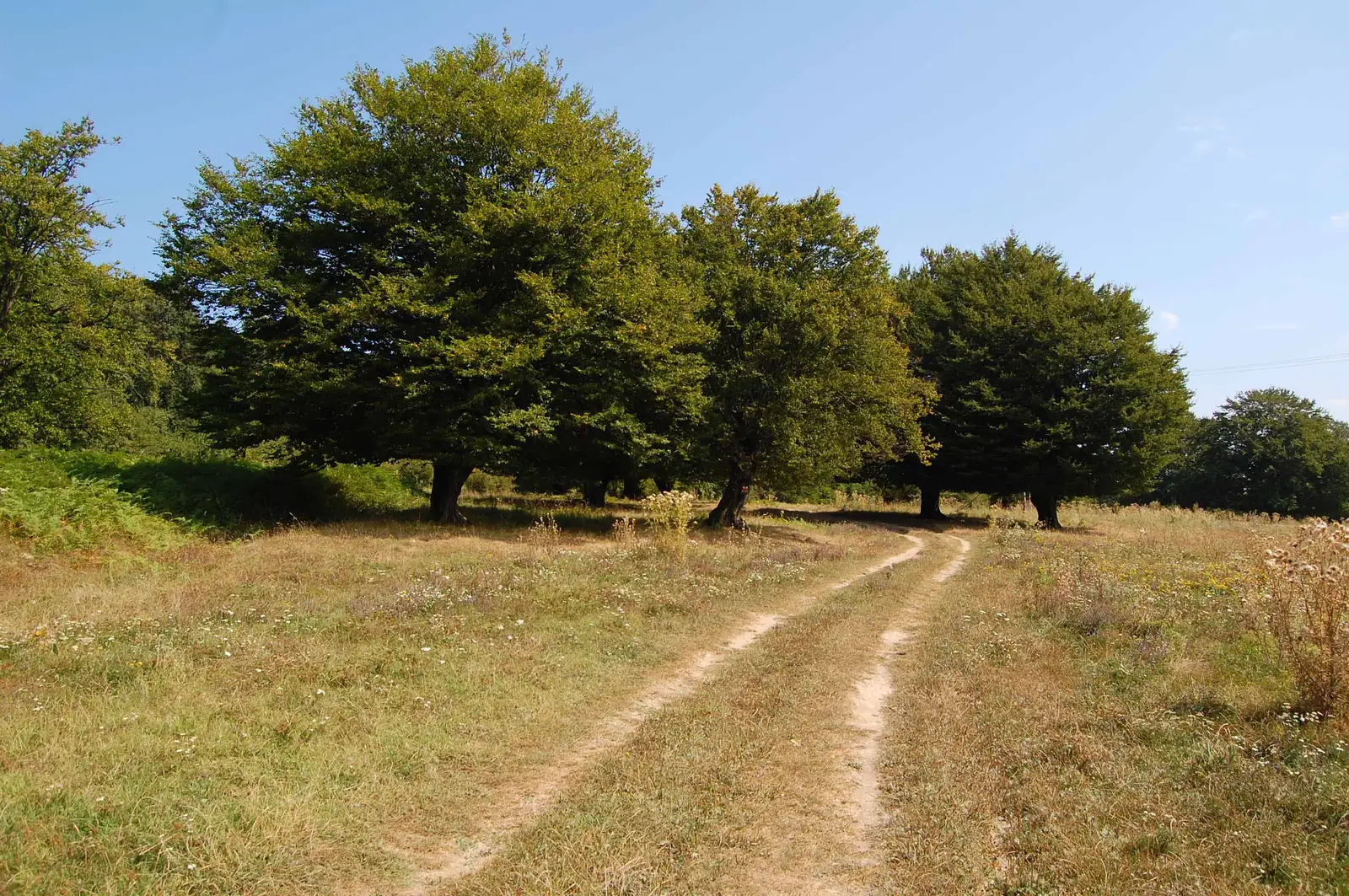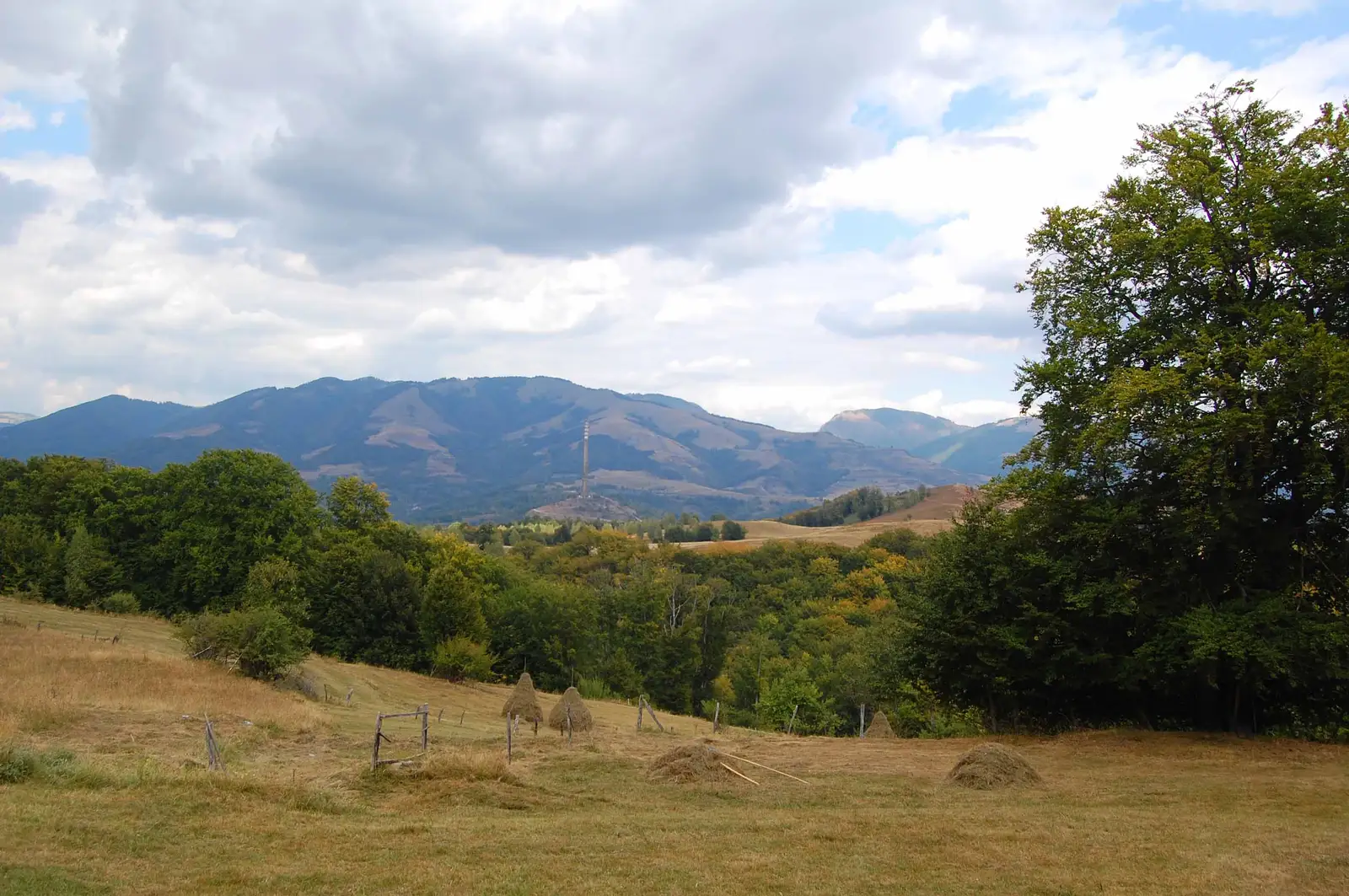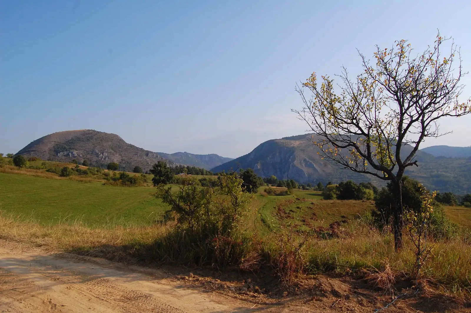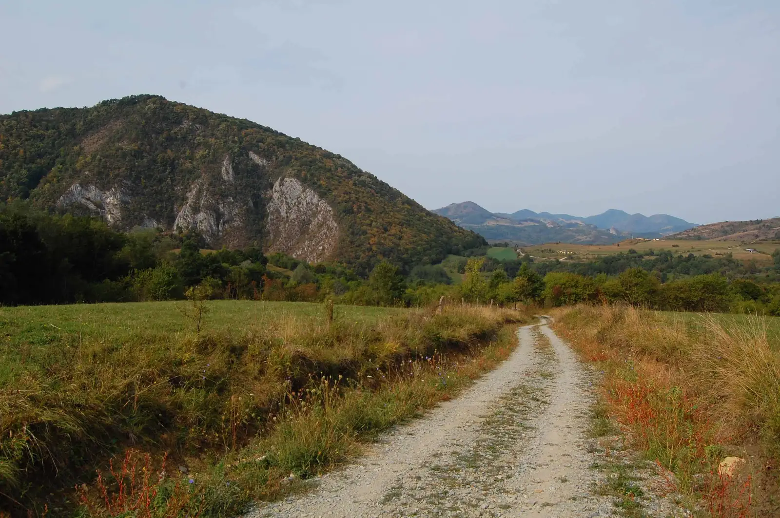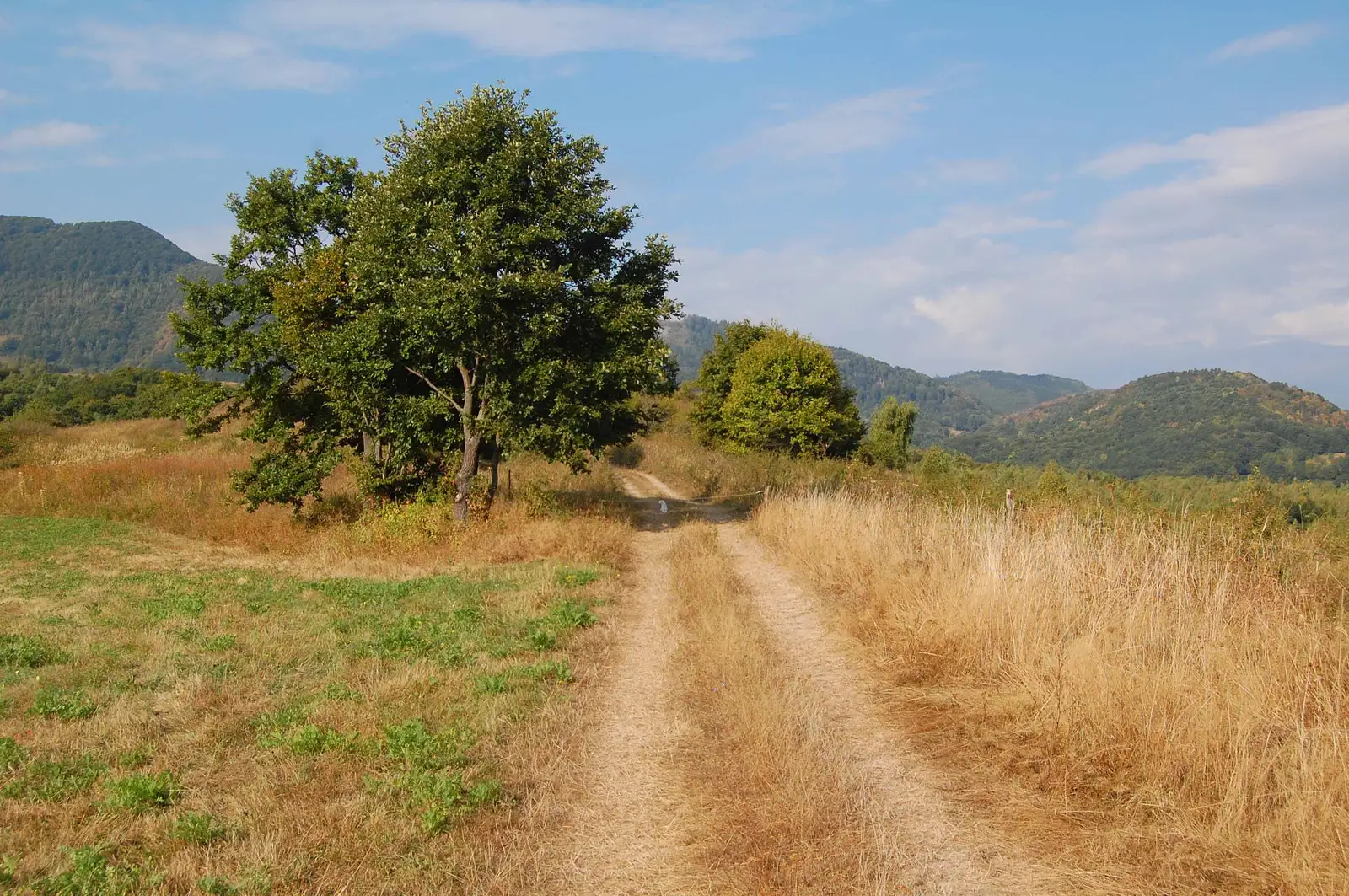 Traseul pleacă chiar din centrul orașului Zlatna, urmărind strada Decebal spre sud. Trecem calea ferată, Ampoiul și șoseaua de centură, apoi ne înscriem în urcare pe strada pavată Vasile Alecsandri, printr-un mic cartier de case modeste. Și după ieșirea din oraș continuăm să urcăm pe drumeagul abrupt, presărat cu troițe numerotate, simbolizând „Drumul Crucii” - cele 14 opriri ale lui Isus. La un moment dat marcajul și calea creștină părăsesc drumeagul săpat în solul roșiatic pentru o potecă spre dreapta, prin pădure. Trecem pe lângă o gospodărie izolată, reîntâlnim drumul și ieșim la pășune, unde semnele sunt rare dar drumeagul este clar. Un indicator turistic ne invită să cotim ușor dreapta și să intrăm din nou în pădurea de foioase. Trecem de un pârâu, apoi poieni, din nou pădure și chiar înainte de ultima urcare întâlnim un izvor străjuit de un pâlc de copaci. Această ultimă urcare abruptă printr-o zonă de pășune nu este bine marcată, dar nu este greu să nimerim ieșirea în culme, într-o șa cu o cruce de lemn, ultimul loc de unde se mai vede Zlatna cu turnul ei inconfundabil. Traversăm drumul de culme care duce la carierele ce mușcă din dealurile aflate în dreapta (vest) și stânga noastră (est) și păstrăm direcția sud pe un drumeag care coboară pe o culme secundară. Trecem prin două pâlcuri de pădure, apoi drumul intră într-o pădure mai serioasă prin care coboară abrupt, până întâlnește prima casă din satul Cib, jos în vale. Marcajul traversează întreaga localitate și continuă în satul Cheile Cibului, mai bine de 4 km pe drumul parțial asfaltat. Aici, ghidați de un indicator trecem pârâul prin vad pe un drumeag care se apropie de pereții versantului drept al Cheilor Cibului. Ajungem într-o poiană cu o mică grădină și o fântână cu cumpănă, ultima urmă a satului, de unde urmăm poteca ce ne urcă într-un loc de belvedere, deasupra văii. Aici este un punct ceva mai dificil, dotat cu niște scări de lemn care ne ajută să coborâm la baza unui perete de stâncă vertical. Traversăm un mic grohotiș, apoi urmăm poteca tăiată în culmea dealului prin pădurea tânără care se îndesește tot mai mult și se transformă într-o zonă cu tufișuri enervante. După ceva senzații neplăcute ieșim în sfârșit la pășune unde imediat cotim stânga (sud) și coborâm la o șa unde în 2012 s-a construit o cruce mare de lemn. Aici schimbăm din nou direcția spre dreapta (vest), trecem pe lângă un izvor amenajat pentru animale, apoi întâlnim un drumeag pe care coborâm până în satul Ardeu, lângă podul peste pârâul omonim. Marcajul urmărește DJ705 în aval circa 1 km, apoi un indicator ne invită să trecem pârâul și să începem din nou urcarea prin pădure. Folosim un drum forestier, care în 1,3 km ne ridică în culmea dealului (160m), unde pădurea lasă loc pășunii și tufișurilor. Coborâm în satul Mada tot pe un drumeag local, care trece prin livezi abandonate, urmărind oarecum linia stâlpilor de electricitate. După ce trecem puntea peste pârâul Geoagiu și ieșim la asfalt, nu continuăm drumul spre cheile Madei, ci cotim brusc stânga pe un drum paralel cu o vale secundară. Ieșim din localitate urmând acest drum și după 2 km intrăm în cătunul răsfirat Stăuini. Aici, la o intersecție de drumuri schimbăm total direcția apucând pe un drumeag ce urcă ocolit pe dealul dinspre nord. Sus mai întâlnim niște gospodării izolate, admirăm Cheile Madei de sus și revenim la direcția inițială într-o curbă strânsă a drumului. Ne instalăm așadar pe culmea dealului pe care o urmăm 3,5 km de aici. Mai trecem pe lângă niște case izolate, cu livezi de pruni, apoi întâlnim o cruce veche de piatră erodată de vremuri și o stână. Drumul străbate pășunea întreruptă de pâlcuri de mesteceni, iar când ne apropiem de Măgurile Săcărâmbului, împădurite dar abrupte spre direcția noastră, cotim ușor stânga pentru a le ocoli. Traversăm un mic pârâu străjuit de pădure, apoi un pâlc de pădure mai serios și ieșim din nou la pășune. Sus aproape de culme, unde cotim stânga (sud-est) folosind o scurtătură, întâlnim un drum mai serios străjuit de stâlpi de electricitate, pe care-i vom urma mult timp de acum încolo. Trecem printr-o succesiune de păduri întrerupte de poieni sau de linia stâlpilor, cale de 4,5 km. Întâlnim pâlcuri de molizi în pădurea de fag sau o zonă cu carpeni multipli, mai mulți copaci din aceeași rădăcină. Ieșim în final într-o poiană mare unde linia stâlpilor se împarte în forma literei T, una merge tot înainte spre vf. Măgura Boiului unde este construit un releu de televiziune, iar alta coboară spre stânga la Geoagiu Băi. O urmărim pe ultima traversând pășunea cu fagi mari și rari, trecem pe lângă un saivan, apoi pe lângă o stână foarte bine gospodărită. La un moment dat părăsim linia stâlpilor spre stânga, însă îi regăsim după circa 650 m. Din nou întâlnim o bifurcație de stâlpi (aici este și o troiță) , unde facem dreapta. Suntem de fapt pe DC30, care leagă satul Renghet de Geoagiu Băi. Traversăm în coborâre un pâlc de case (cătunul „După Deal”), apoi trecem valea Ceretului pe un pod și urcăm ușor în localitatea Geoagiu Băi, unde putem vizita Băile Romane, Cascada Clocota, Grota Haiducilor, etc.