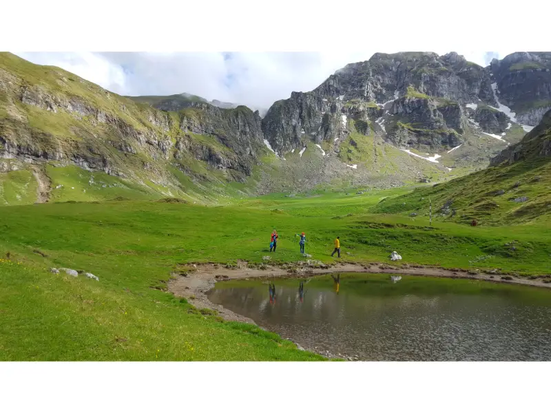 Daca tot nu vedem nimic, ne hotaram sa coboram in caldare, la Lacurile Tiganesti. Pana ajungem noi la lacuri, se ridica si norii si incepem sa ne delectam cu tot peisajul din jur. Vedem spre Turnurile Tiganesti, pe unde vom ajunge a doua zi. Ajungem inapoi la corturi, la refugiu, pe Culmea Tiganesti, si ne asteapta cu totul alt peisaj. Nu mai sunt nori, a iesit soarele, si ne gandim cu bucurie la apusul de care ne vom bucura in curand.