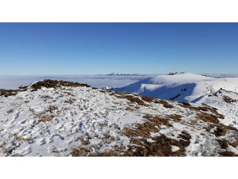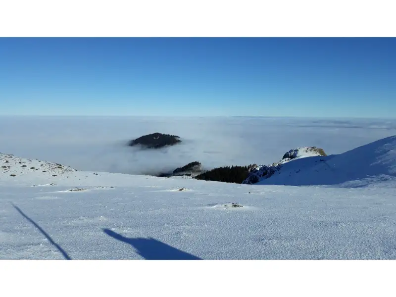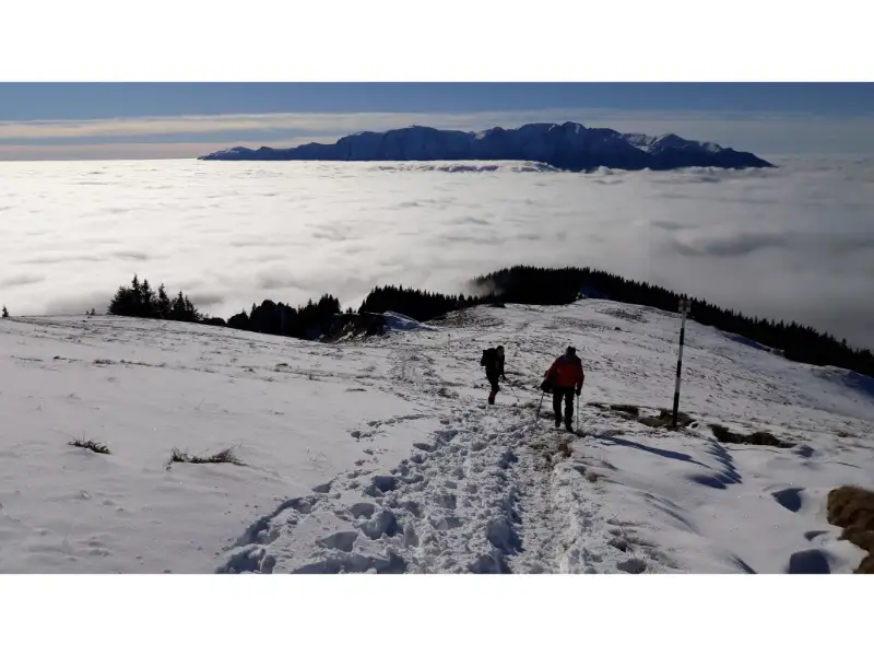 Ce-i drept, era putina gheata prin canion, iar unele trepte erau niste capcane alunecoase, insa, cu putina atentie am parcurs canionul fara nici o problema. Trebuie sa mentionez ca unele scari se miscau, acestea fiind fixate de stanca in mod imporivzat. Apropiindu-ne de golul alpin, parea ca incepem sa iesim peste plafonul de nori, si sa se confirme supozitia ca vom avea parte de mare de nori. Daca pana in golul alpin nu am intalnit zapada deloc, fix la iesirea din padure, portiunile cu gheata au necesitat coltarii. Apoi, la golul alpin, soarele ardea ca intr-o zi de vara iar zapada era moale, numai buna de mers fara coltari. Ne-am dezbracat de straturile groase, caci, cu fiecare pas ne incalzeam si mai tare.
