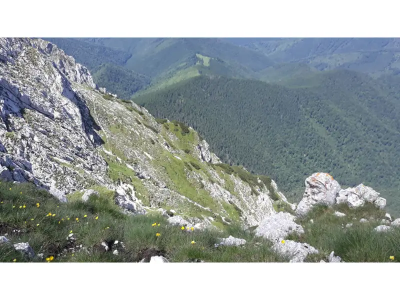 Pornin spre Refugiul din Saua Grindului, unde ajungem dupa cativa pasi. Aici intersectam traseul care vine din Plaiul Foii, pe La Lanturi. La momentul respectiv nu fusesem pe acel traseu, insa in momentul in care postez asta lucrurile s-au schimbat. Am postat si despre traseul pe La Lanturi, povestioara ce se regaseste in profilul meu, daca sunteti curiosi. Comparativ cu Creasta Nordica a Craiului, portiunea asta sudica este mai usoara. Are mai putine zone expuse, si este mai putin de urcat, desi tot e lunga. Dupa Vf. Lespezi ajungem deasupra Poienii Inchise, un loc greu accesibil, fara traseu marcat.