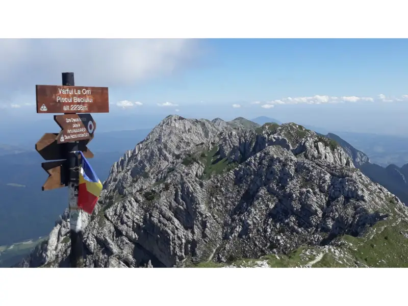 Suntem in plina vara, in luna lui cuptor. In vreo 3 ore ajungem la Vf. La Om/Piscul Baciului, dupa inca o pauza la Refugiul Grind. Fata de alte ture, nu asta era destinatia finala, asa ca am facut si la Piscul Baciului o pauza binemeritata, dupa ce am urcat cu soarele deasupra noastra. Noroc ca am mai avut parte de umbra peretelui Coltilor Gainii, din dreapta noastra. Am avut parte de o vreme senina. Daca tot ne-a batut soarele, macar avem privelisti de sus. Admiram Fagarasul, Iezer-Papusa, Bucegii si Leaota, Postavaru, Piatra Dragoslavelor si ce se mai vede de sus.