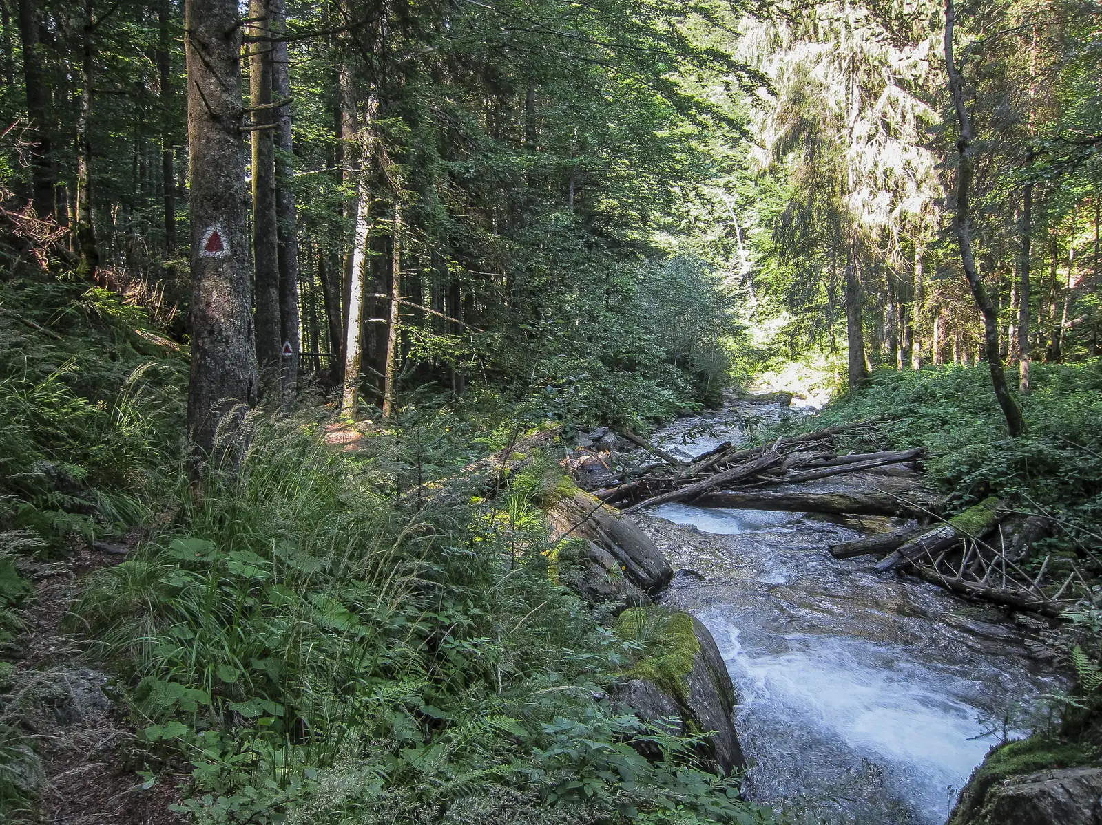 După cca. 2.5 km, intrăm pe potecă și trecem de pe un mal pe altul, pe valea tot mai sălbatică. Admirăm apele cristaline şi înaintăm prin vegetaţie. După cca 2 h de la bifurcație, găsim un stâlp indicator care ne scoate de pe vale. Urcăm pe malul vestic,i tot mai pieptiș, în serpentine scurte, pe poteca Plaiul Hoțului, printr-o zonă de zmeuriș.