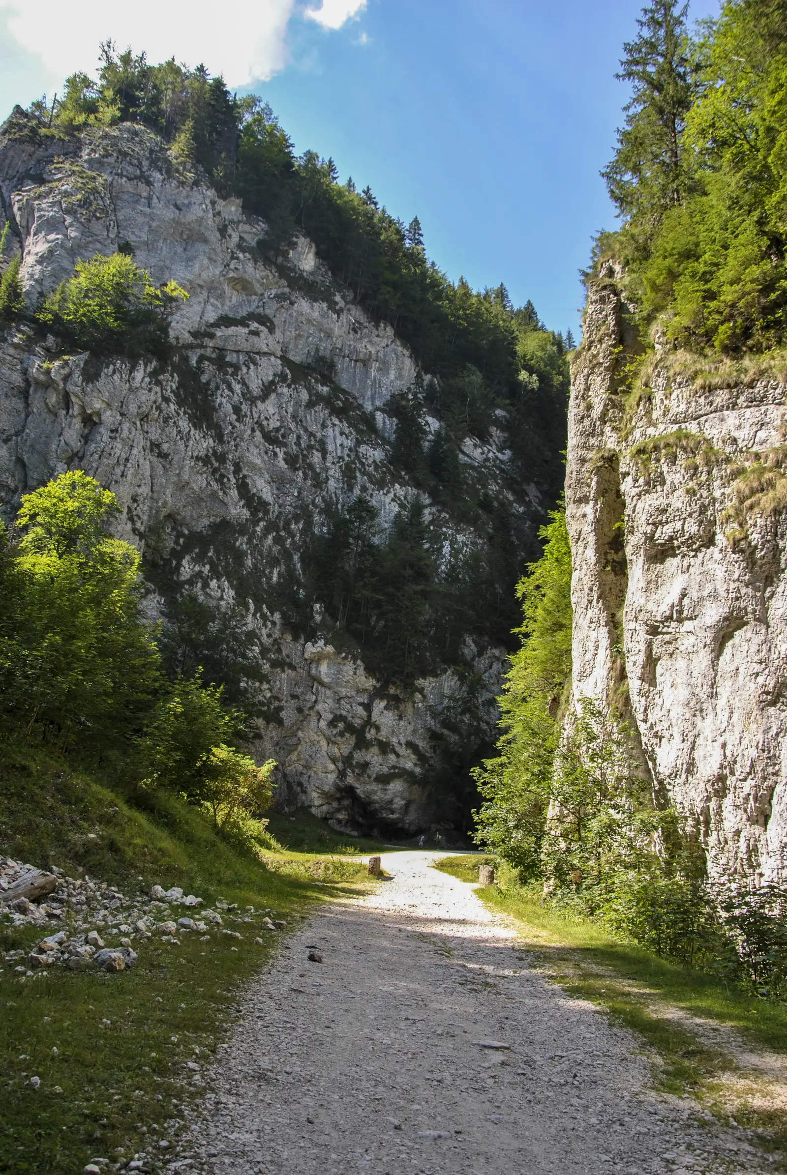 O troiţă marchează intrarea în Cheile Pisicii, apoi străbatem un tronson de vale îngustă, bolovănoasă, presărată din loc în loc cu cascade în miniatură. Peisajul este unul sălbatic, vegetația abundentă și e nevoie de atenție pentru a nu intra cu picioarele în apă. Pereţii sunt apropiaţi la 2.5-3 m distanță, spectaculos.