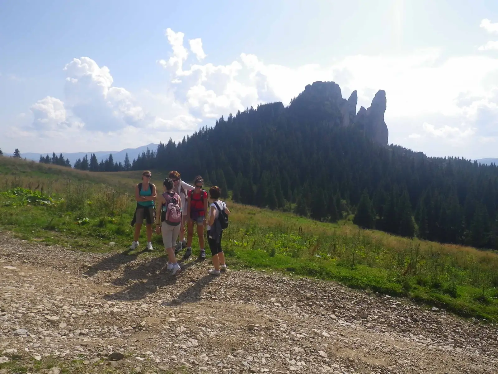 Drumul urcă susţinut până la intersecţia cu șoseaua Transrarău (Chiril - Pojorâta), în apropiere de Hotelul Alpin Rarău, unde întâlnim traseul principal de creastă Bandă Roșie. După un parcurs de câteva sute de metri pe asfalt, intrăm pe drumul forestier din stânga, ce duce pe lângă punctul Salvamont și Cabana lui Mao, iar mai apoi Staţia Meteo. Lăsăm la stânga drumul de acces și marcajele Punct Albastru spre Vf. Rarău, apoi poteca dinspre Pietrele Doamnei, marcată tot cu Punct Albastru și ținem drumul de creastă.