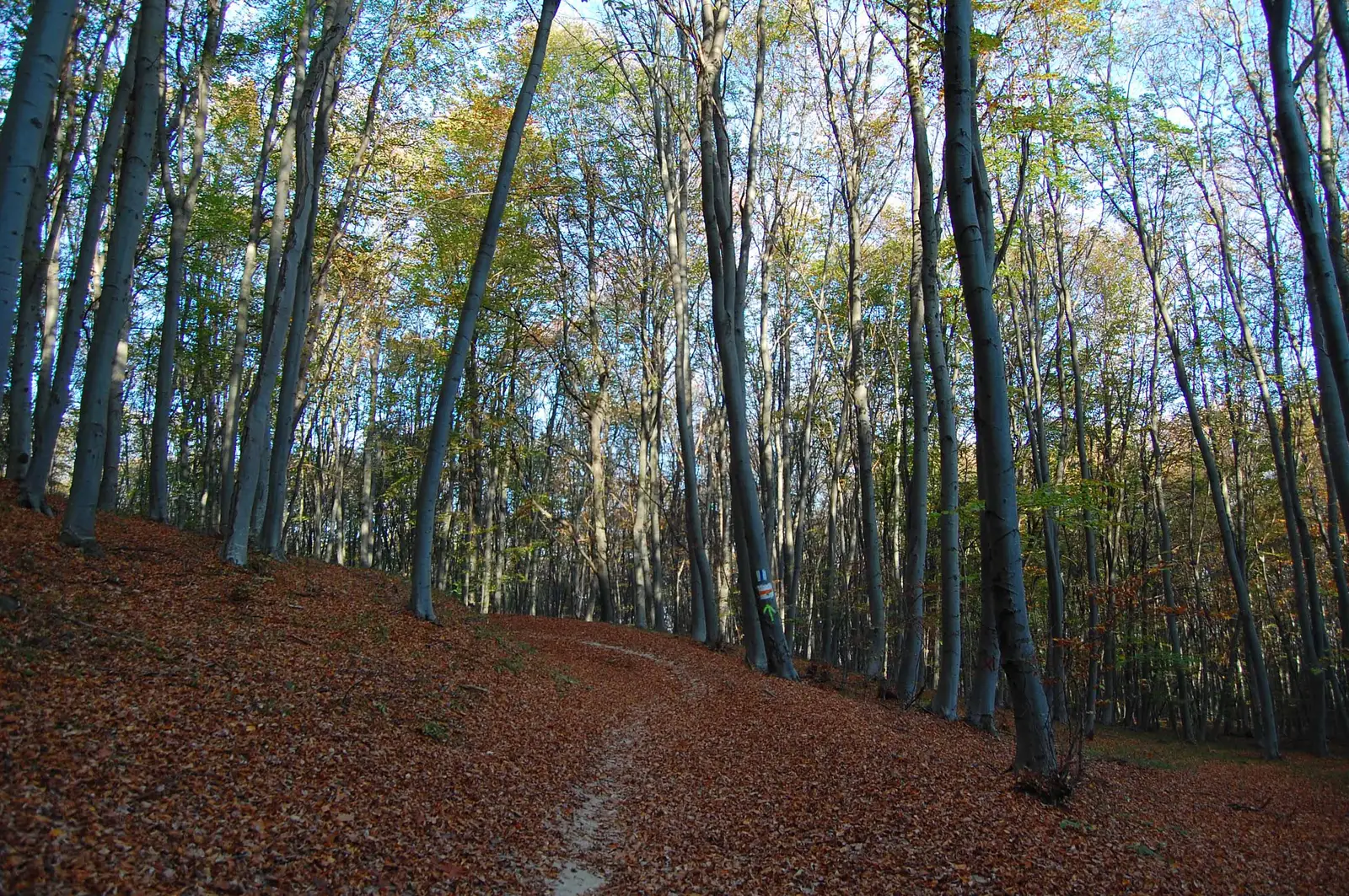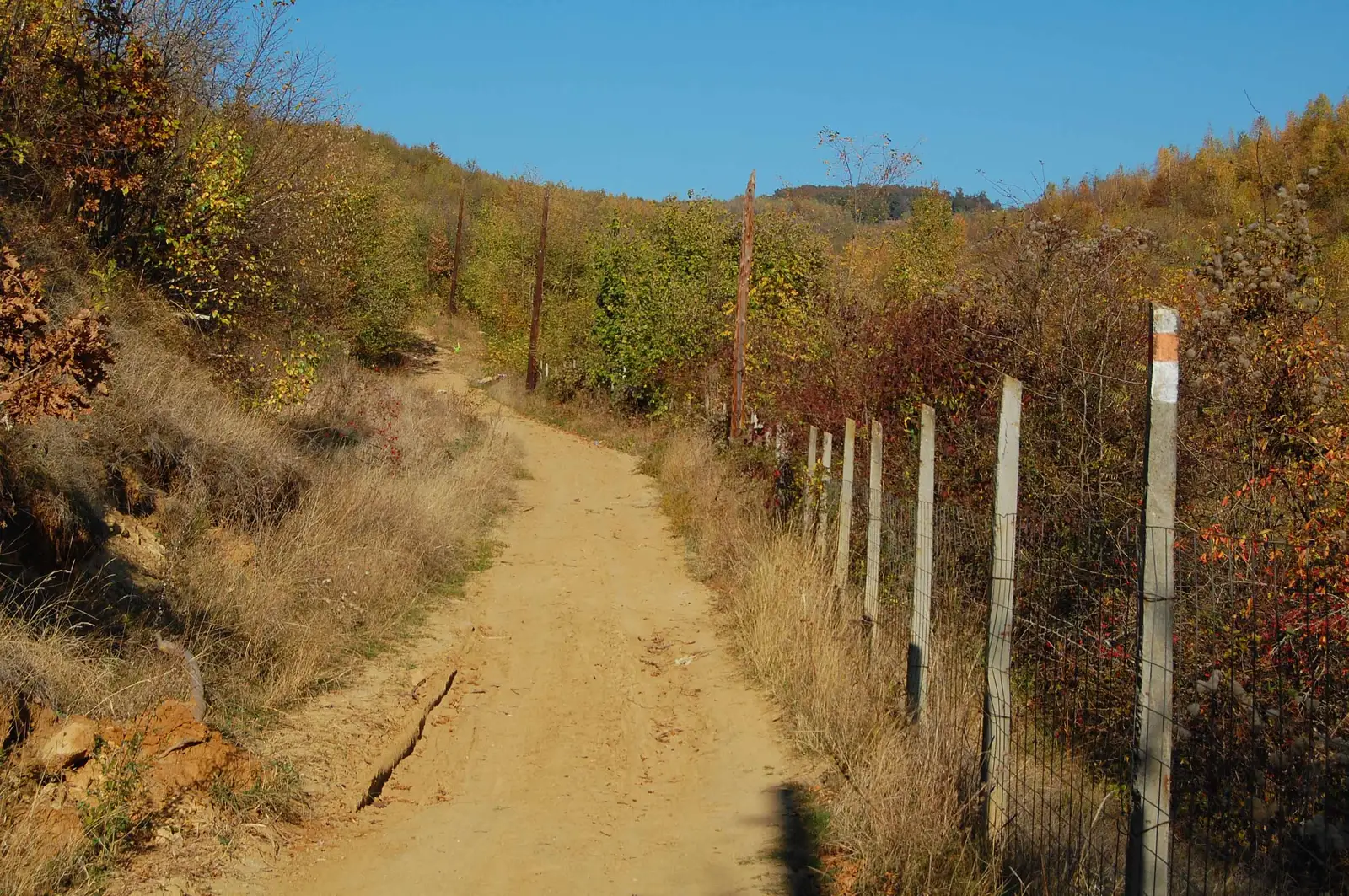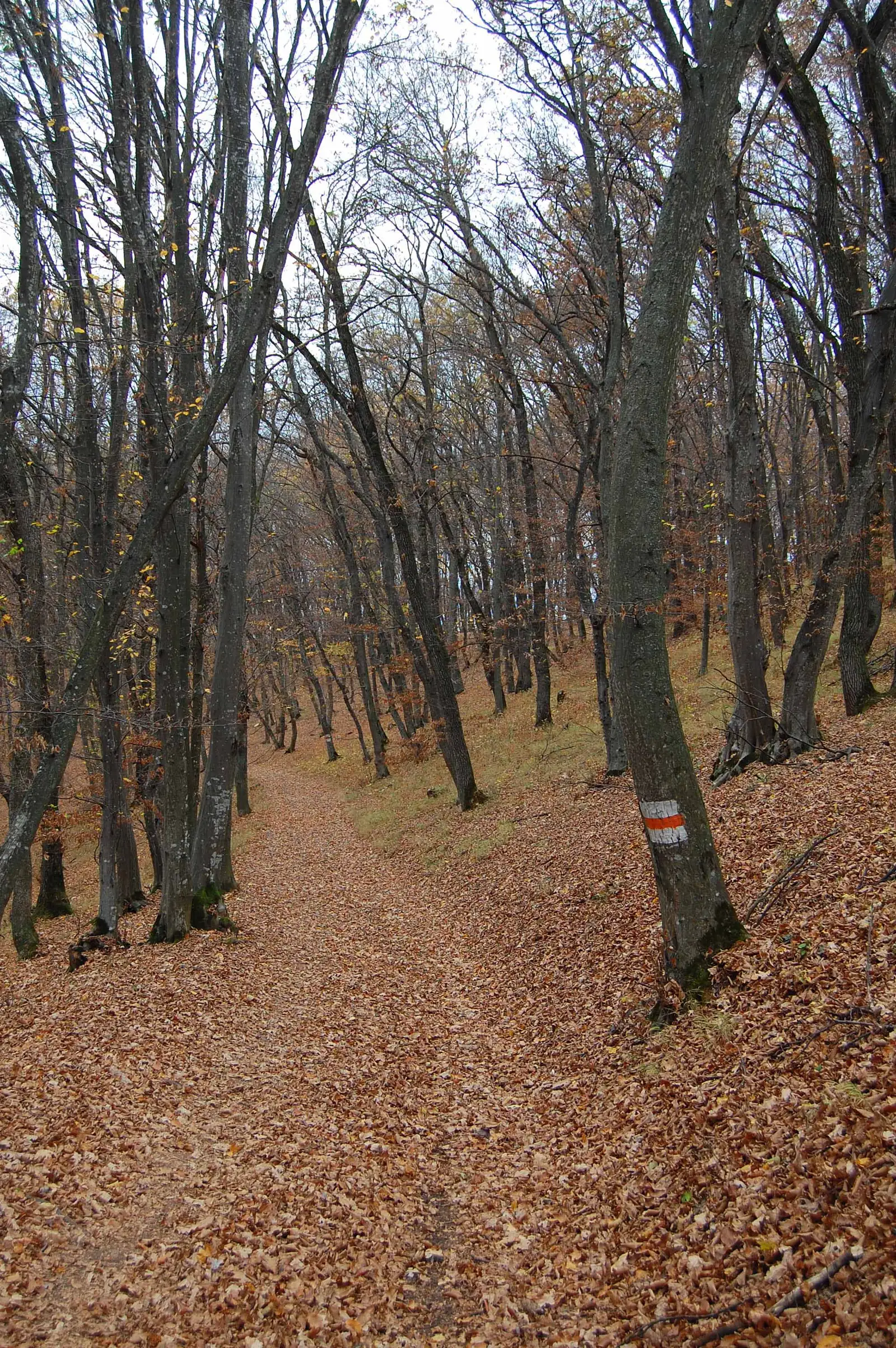 Aici lăsăm la stânga poteca de legătură cu BR, marcată BA (traseul 15), ținem drumul principal pe lângă pensiune, apoi urcăm pe un drumeag la stânga, în pădure, aproape de un pârâu, traversăm valea și ieșim în culmea dealului, unde regăsim marcajele BR.