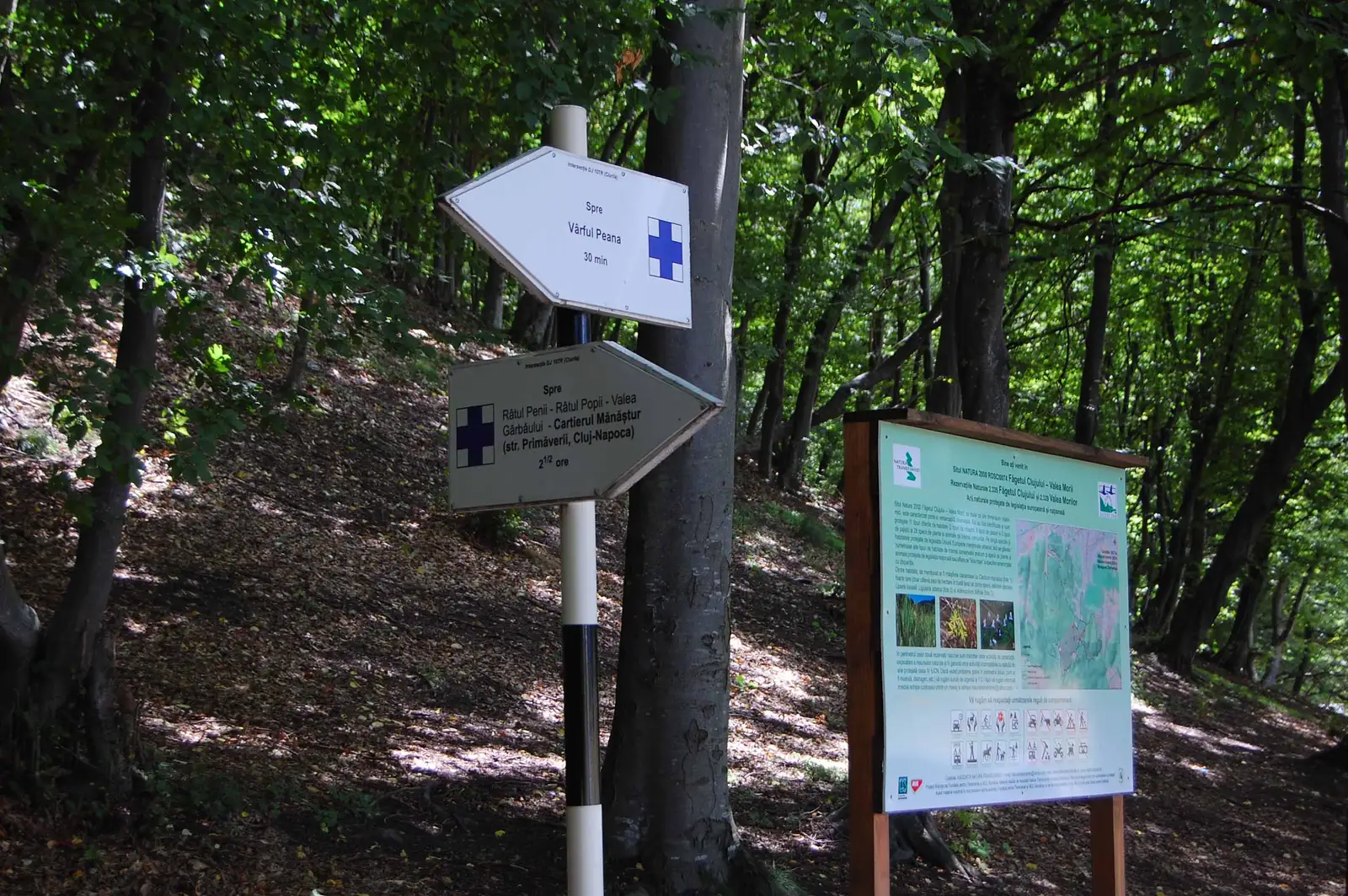 La scurt timp, schimbăm direcția de mers spre dreapta (sud), apoi la o intersecţie de poteci, urcăm spre stânga ceva mai abrupt până într-o șa. Aici facem dreapta și străbatem o frumoasă creastă împădurită în urcare ușoară spre Peana. Ieșim lângă gardul unei ferme, apoi la Vf. Peana (832 m), cel mai înalt din masiv.