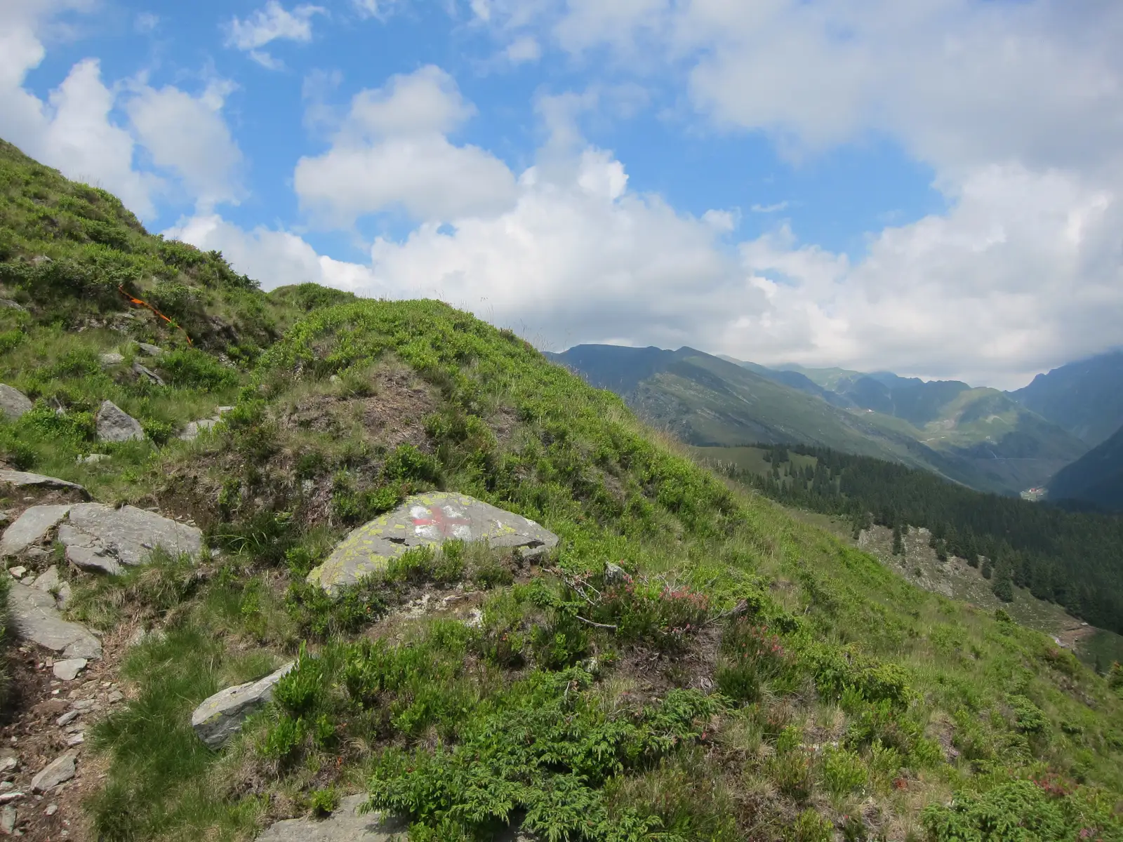 CR merge pe curbă de nivel ascendentă, pe deasupra unor stâne, urcă în serpentine, printre jnepeni şi vegetaţie pitică și întâlnește un drum vechi de exploatare care ne conduce în Culmea Podeanu, mai exact în Şaua Podeanu, la intersecţia mai multor drumuri pastorale.