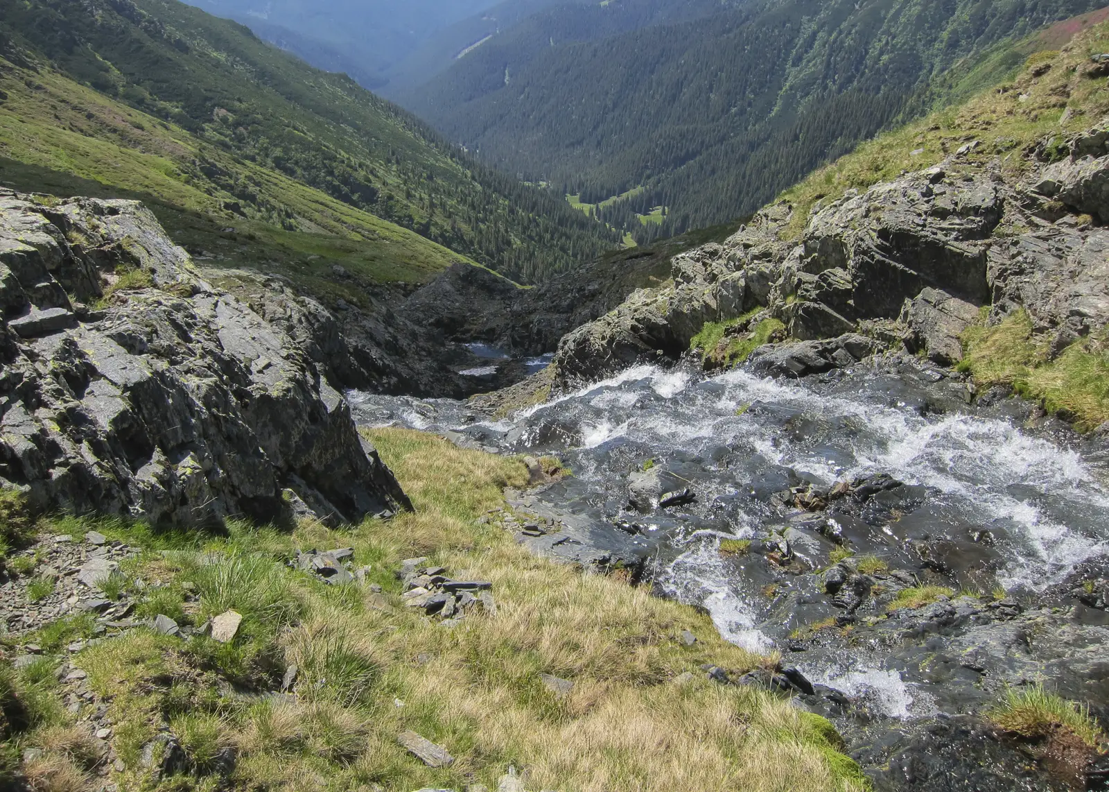 Frumoasa și puțin cunoscuta vale Izv. Scării își are obârșia sub șaua Scării și formează o salbă de cascade ce însumează o cădere totală de cca. 200 m, între care Cascada Pișătoarea, cum este denumită de localnici, cu o căderea continuă de 50 m. Nici nu băgăm de seamă când am ajuns deasupra cascadelor, într-o căldare glaciară cu pășuni înierbate și bolovani, la 460 m D+ față de stâna din Scara. Trecem apa pe malul drept și începem urcușul pe un vâlcel, printre grohotișuri, până la izvoarele P. Izv. Scării și după alte cca.250 m D+ ajungem în Șaua Scării (2152 m).