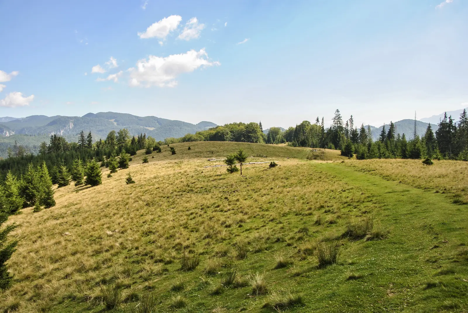 Continuăm urcarea pe versantul drept, trăbatem o poiană lungă, apoi urmăm un drum de TAF, prin poiana de sub stâna Vopselelor. Drumul ne apropie de valea Pârâului Ulucelor pe care îl părăsim după o scurtă urcare prin mijlocul defrişării De aici, în alte câteva minute, ajungem în capătul estic al Muchiei Frumoasa, într-o poiana largă, unde întâlnima traseul de creastă al Pietrei Craiului, marcat PR (traseul 20) - care continuă de aici spre Muntele Pietricica, trecând de câteva stâne.