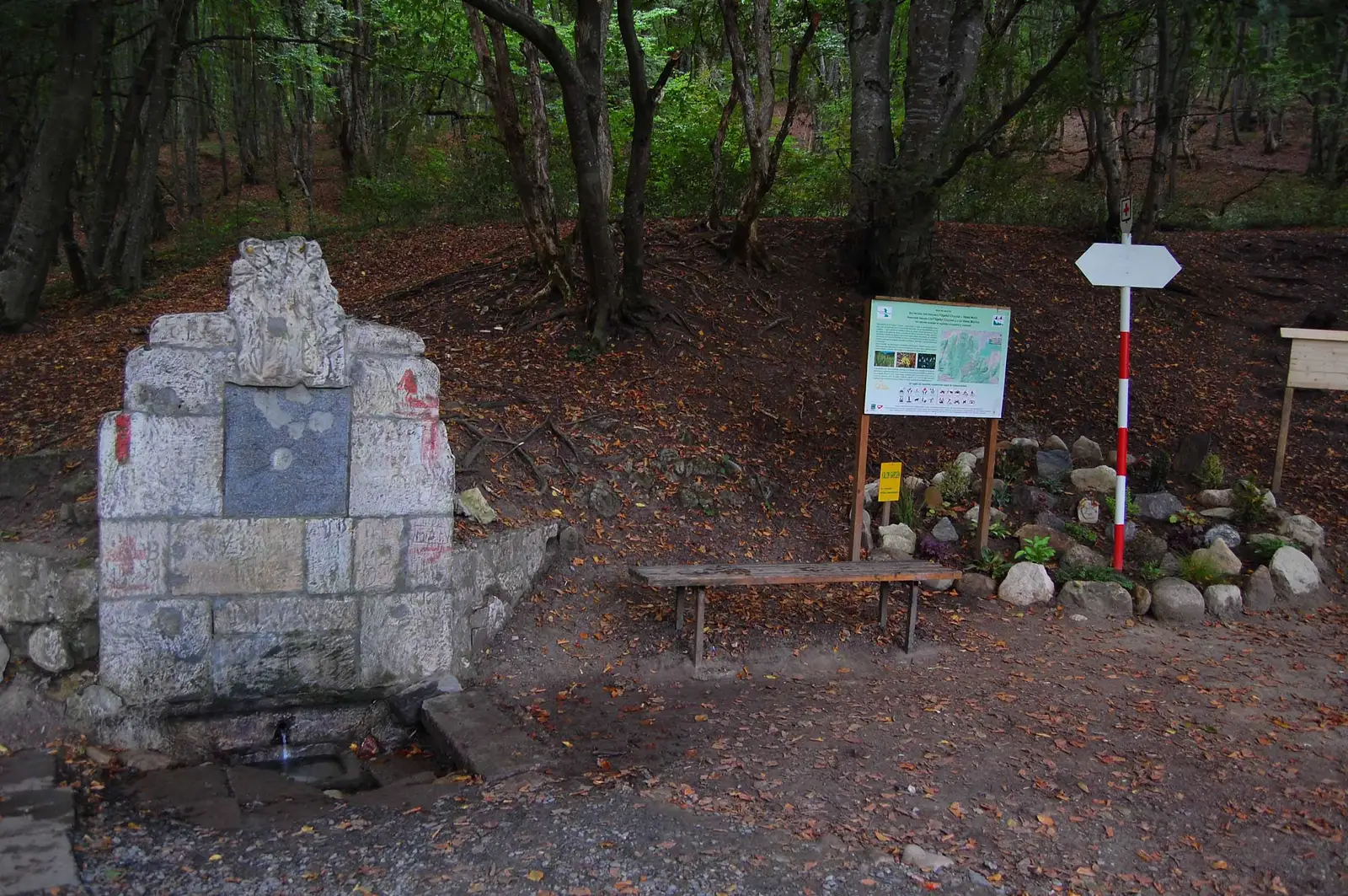 După aprox. 1 h și aproape 220 m D+ întâlnim Drumul Sălicei, loc marcat de un izvor amenajat cu troiţă (Izvorul lui Ola). Traversăm drumul, continuăm pentru scurt timp paralel cu acesta, depășind izvorul, apoi începem să urcăm prin pădurea de fag. Pentru un timp, folosim un drumeag mai serios, până aproape de Vf. Peana, unde intrăm pe o potecă care ne duce direct la vârf, cel mai înalt din masiv.