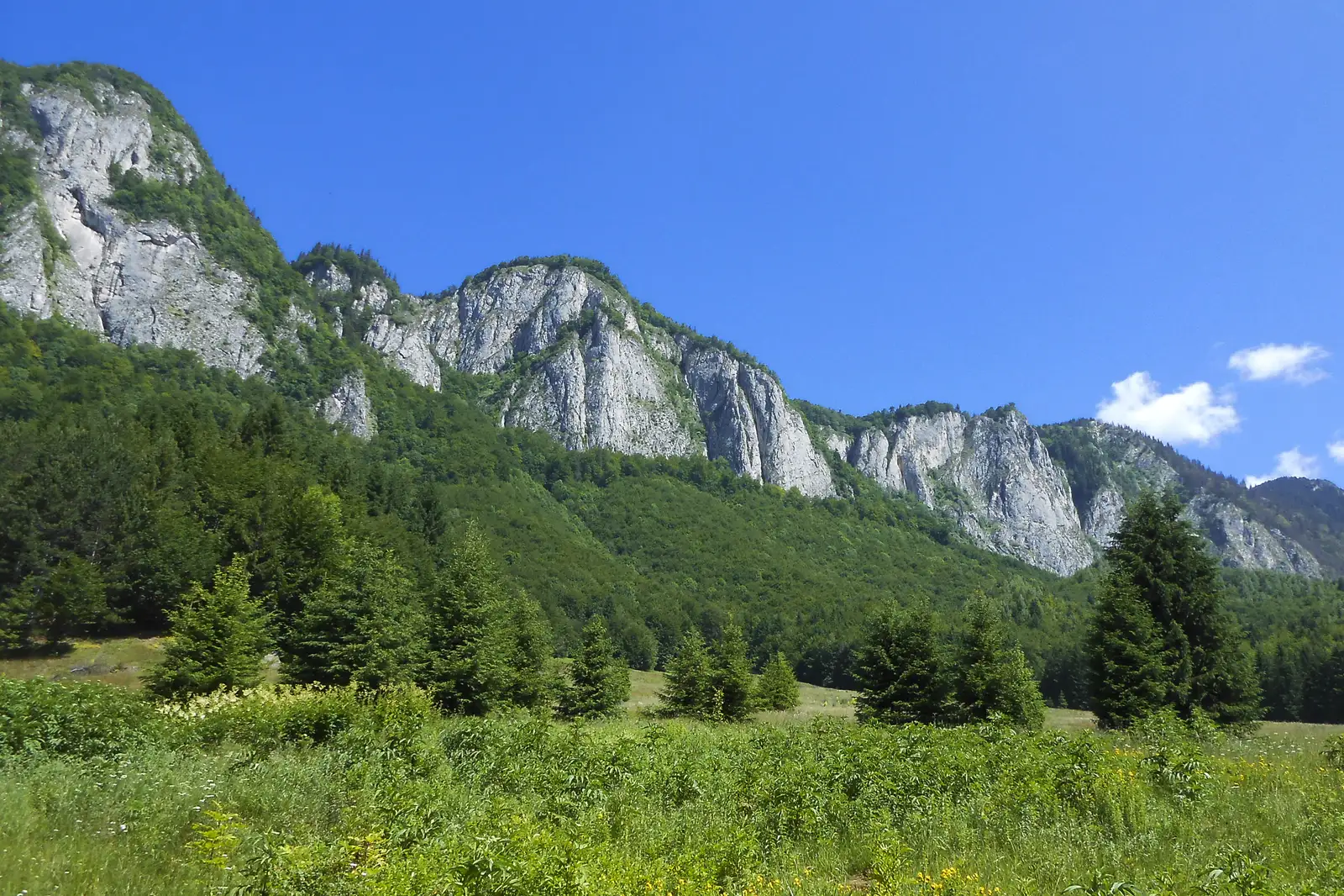 Aici întâlnim Drumul Galben (traseul 38) - care urcă pieptiș la cabanele Postăvarul şi Cristianul Mare (nerecomandat iarna!) și coborâm (pantă 20,7%) pe un drum de exploatare la Valea Calului, la capătul căreia, trecem bariera și ajungem pe valea Timișului (DN 1).