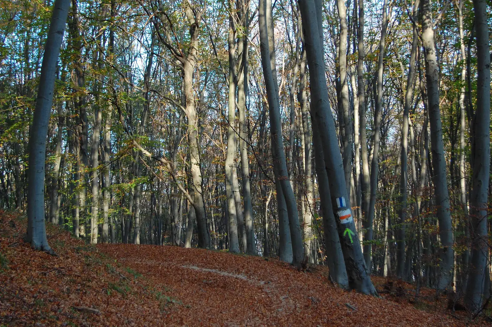 De la Izv. Bilașcu ni se alătură un marcaj nestandard - Triunghi Portocaliu (traseul 17) folosit de alergători, drumeţi și cicliști în combinație cu celelalte trasee din zonă sau ca o scurtătură a BA. Traversăm mai multe fire de apă, apoi urcăm cca. 100 m D+ până la liziera pădurii în drumul de culme dintre Casele Micești și Vf. Peana, marcat BG (traseul 6).