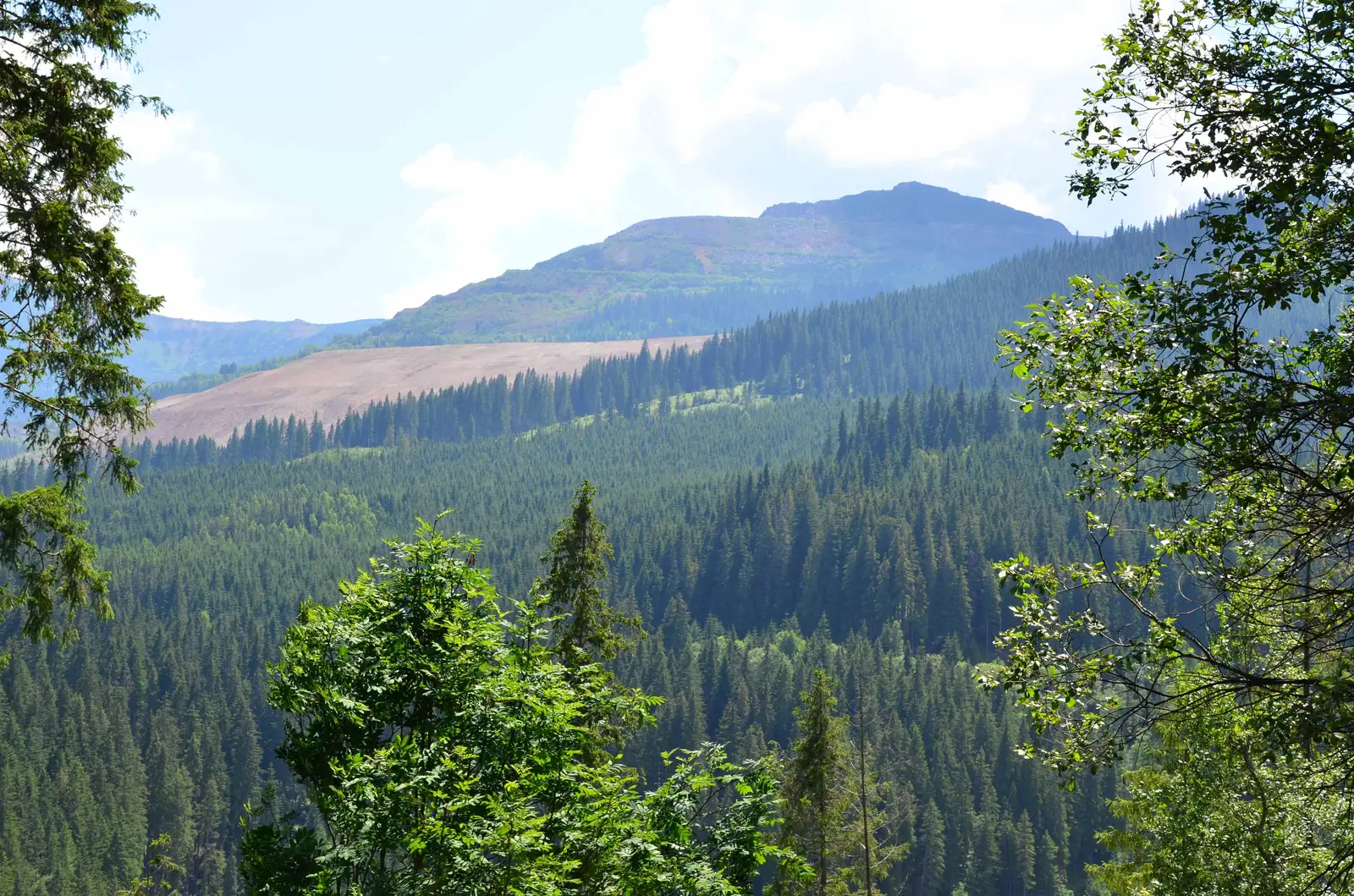 Părăsim asfaltatul spre Pârâul Pinul, traversăm o zonă cu steril (haldă de depozitare a vechii mine) și continuăm spre valea Pârâului Dumitrelul Mare. Din loc în loc avem priveliști frumoase asupra ”trapezului” format de vârfurile Negoiu Unguresc şi Pietrosul Călimani.