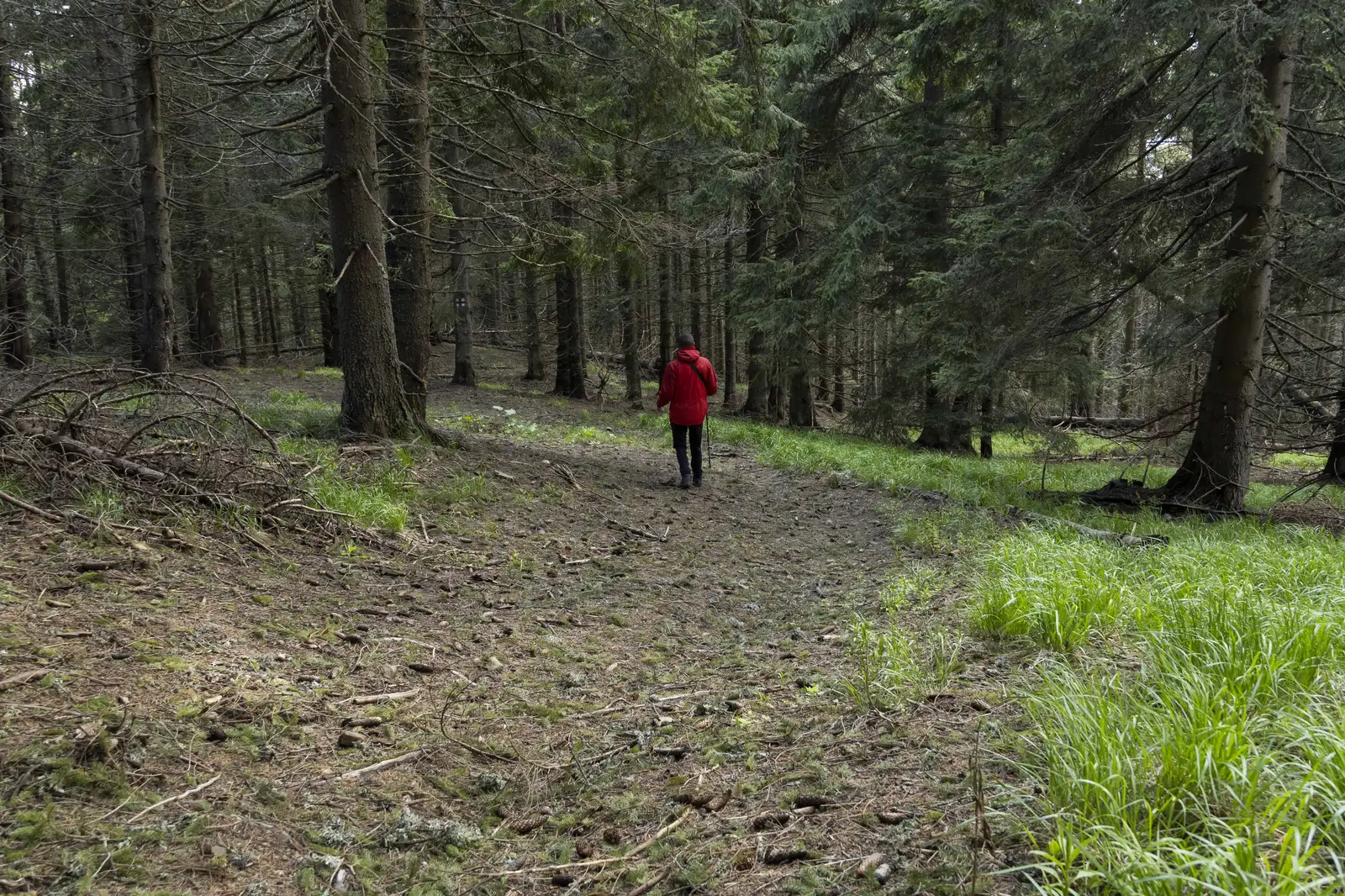 Traversăm zona mlăştinoasă și trecem pârâul Apa Roşie pe un pod, apoi ajungem la Cantonul Apa Roșie. De-aici ne înscriem pe pârâul Românului spre Culmea Ursului (Medve). Urcăm pieptiș aprox 1 h până lângă Noul Refugiu Unguresc, unde întâlnim întâlnim poteca de creastă principală, cu marcajele BA (traseul 1) - ce urcă din Slănic-Moldova pe Culmea Căprioarei și PR (traseul 14) - dinspre Lemnia.