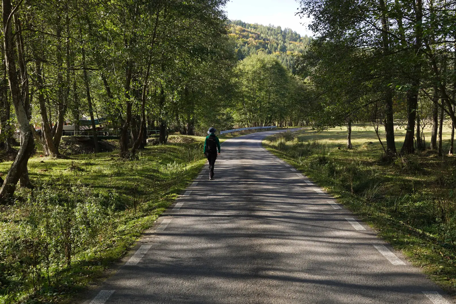 Mai sus drumul se îngustează, iar la dreapta văii avem gardurile ce delimitează Parcul de Vânătoare Mereni. După ce lăsăm un drum de exploatare la dreapta, la mai puțin de 1 km, trecem un pod de piatră, dincolo de care găsim indicatorul cu direcţia spre cetatea Almás, până la care avem de urcat cca. 1 h și aprox. 200 m D+.