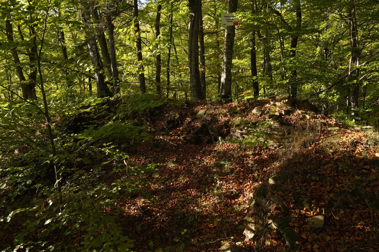 Valea Lemnia Mică (Lutoasa), numită și Hegyes (Ascuțită), dă numele piciorului pe care se află ruinele Cetății Almás (Mereni). Rămânem pe valea Lemniei Mari și ne atrage atenția un bolovan mare de gresie marcat TR care ne confirmă intrarea în traseul.