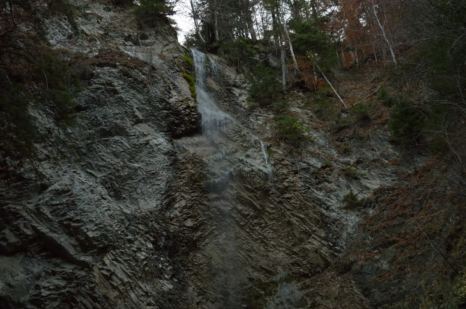 Acest traseu se desprinde din marcajul PG care vine din localitatea Păuleşti. Marcajul urmăreşte albia Mioarei, apoi se încrie prin pădure pe valea îngustă a unui afluent din dreapta a acesteia pentru a ajunge la Cascada din Horn (Mioarele).