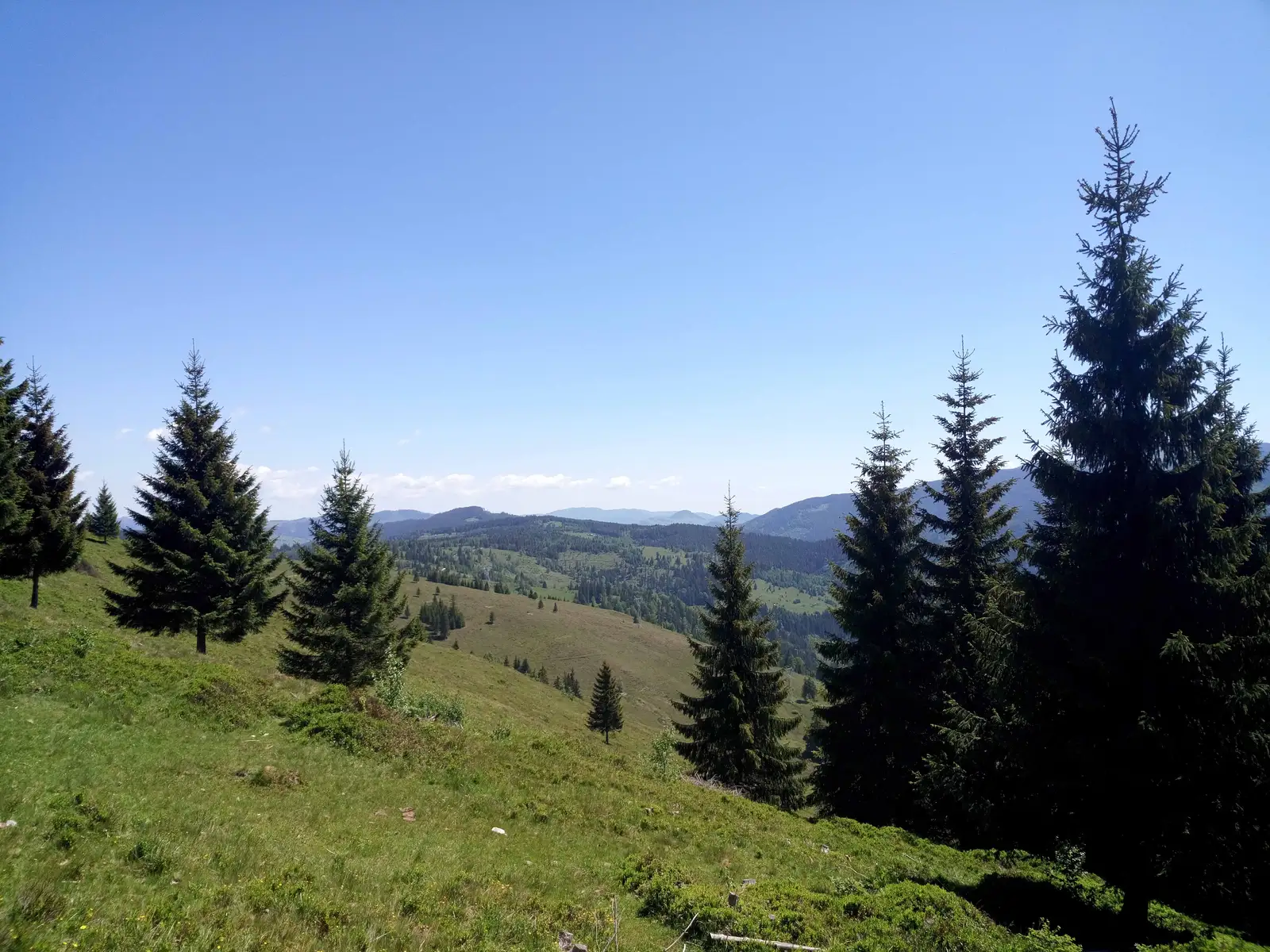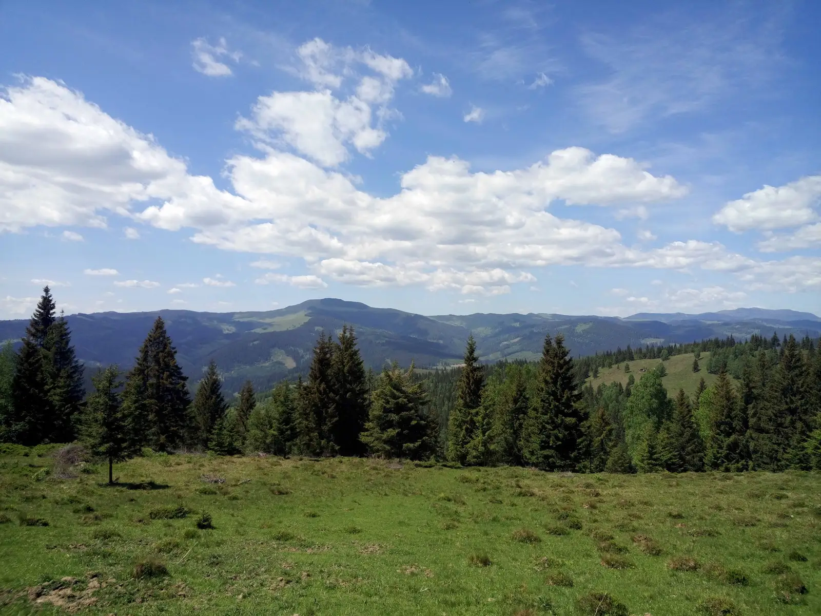 Plecarea în traseu se face chiar din Pasul Mestecăniş, urmând drumul spre Obcina Mestecănişului, pe direcţie vest, în paralel cu traseul turistic marcat cu bandă roşie. Drumul urcă foarte lejer cale de 5 km pe culmea obcinei până se ajunge la o poiană foarte largă, cu deschidere completă pe versantul vestic. De aici se observă toată creasta Munţilor Suhard, iar la poalele acestora comuna Ciocăneşti. Traseul de bicicletă părăseşte traseul turistic, aceasta din urmă merge în dreapta, iar traseul nostru trece pe Muntele Oiţei, urmând o coborâre lungă şi deosebit de frumoasă de peste 4 kilometri până în centrul comunei Ciocăneşti.