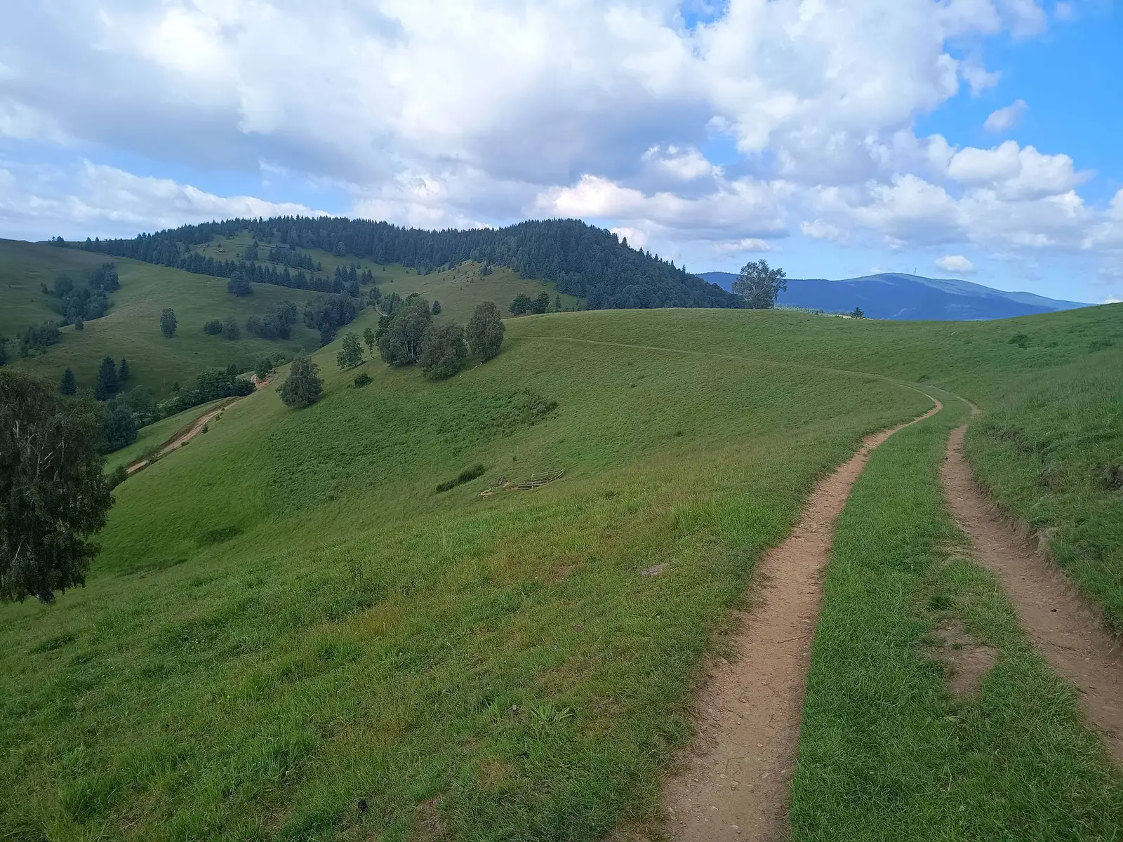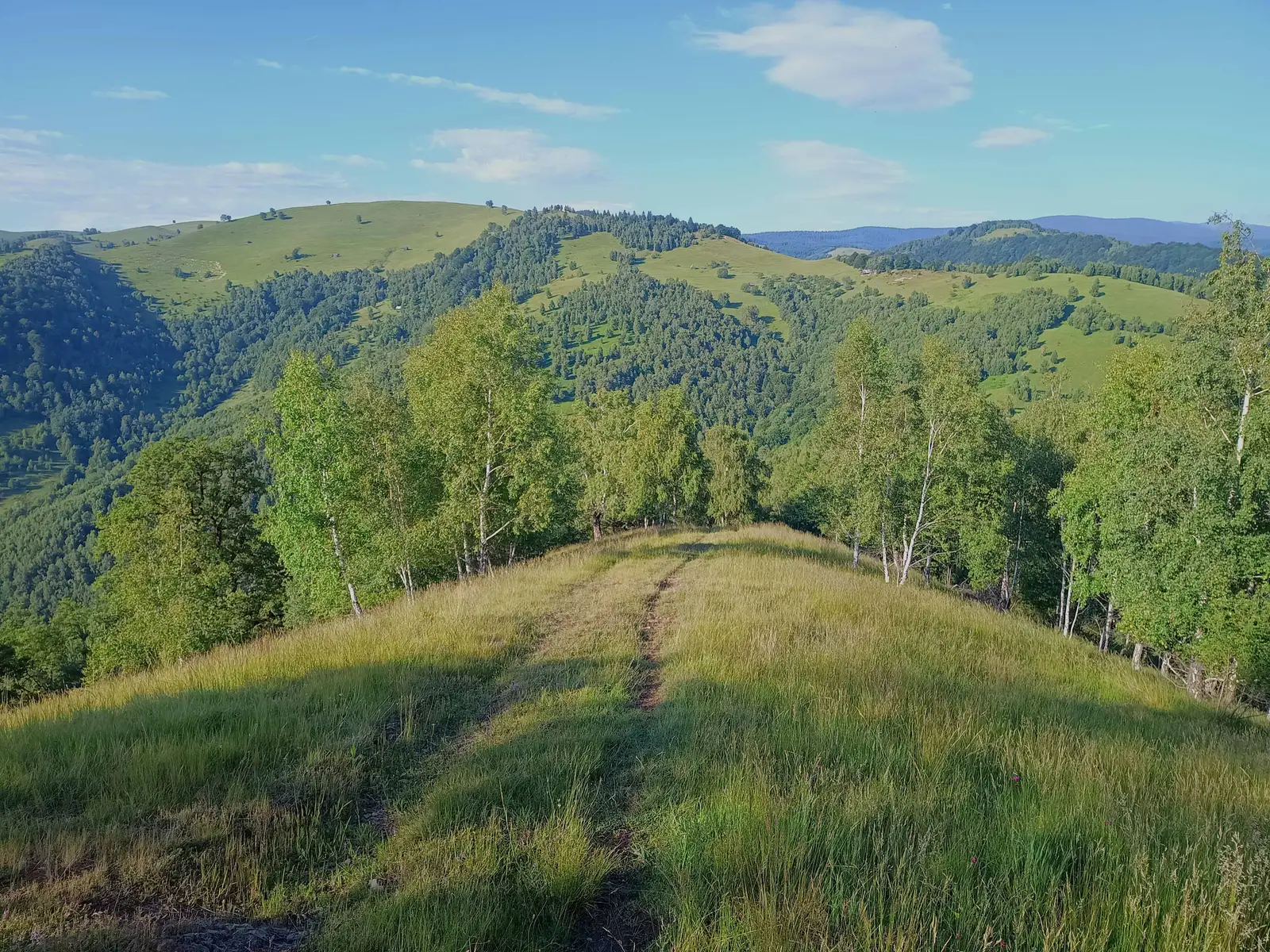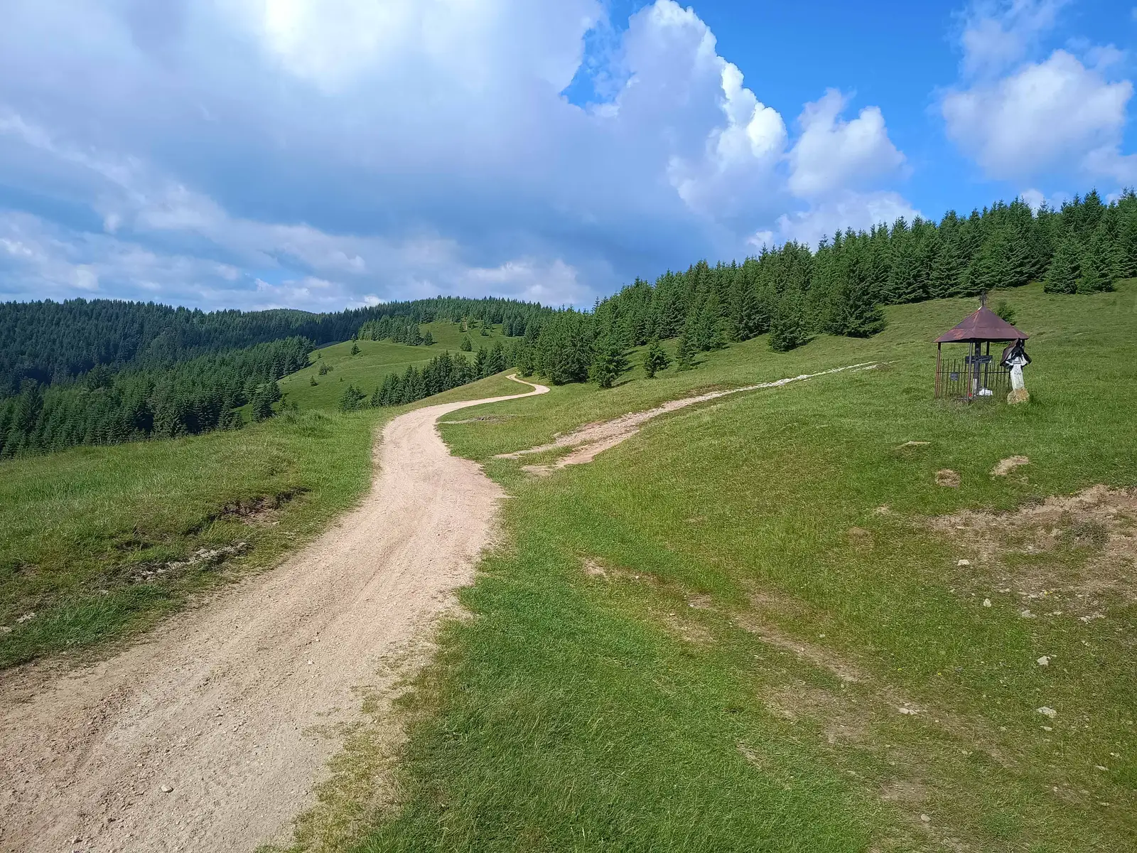 Din Răşinari folosim poteca ce urcă pe Dealul Coastei, care mai sus devine un drum ciclabil. Cu ceva efort urcăm în pitorescul Vârf Fragii, printre mesteceni. Peisajul este încântător. Urmează o coborâre abruptă, ocolirea Vârfului Plaiului prin dreapta (vest). După întâlnirea drumului ce urcă pe Valea Caselor apar primii molizi şi drumul devine mai lin, tăiat în munte pe partea stângă (est). Ne întâlnim cu drumul de culme pe care-l urmăm de acum încolo o vreme. După Poiana Tomnatec urmează o alternanţă de drum ciclabil cu drum plin de bolovani. Trecem succesiv prin poienile La Icoană, Lupilor, Onceşti şi Muncel. Din Muncel un drum bun de macadam ne coboară în Păltiniş, cea mai veche şi cea mai înaltă staţiune montană din ţară. La Păltiniş Arena părăsim asfaltul pe un drum pitoresc şi ne înscriem în coborâre pe Culmea Blidăriei până la DJ106J. Urcăm pe acest drum în serpentine 2,5km şi 190m D+ până la intersecţia cu DJ106A. De aici urcăm pe lângă 2 relee GSM în culmea Dealului Ganţa la un loc de popas amenajat de unde urmăm culmea spre SE. La un moment dat poteca coboară pe un picior şi e tăiată în mod inteligent în coasta muntelui pentru o coborâre lină deosebit de plăcută pentru ciclişti. Apoi din nou pe culme şi la fi nal prin fânaţe ajungem la Răşinari.