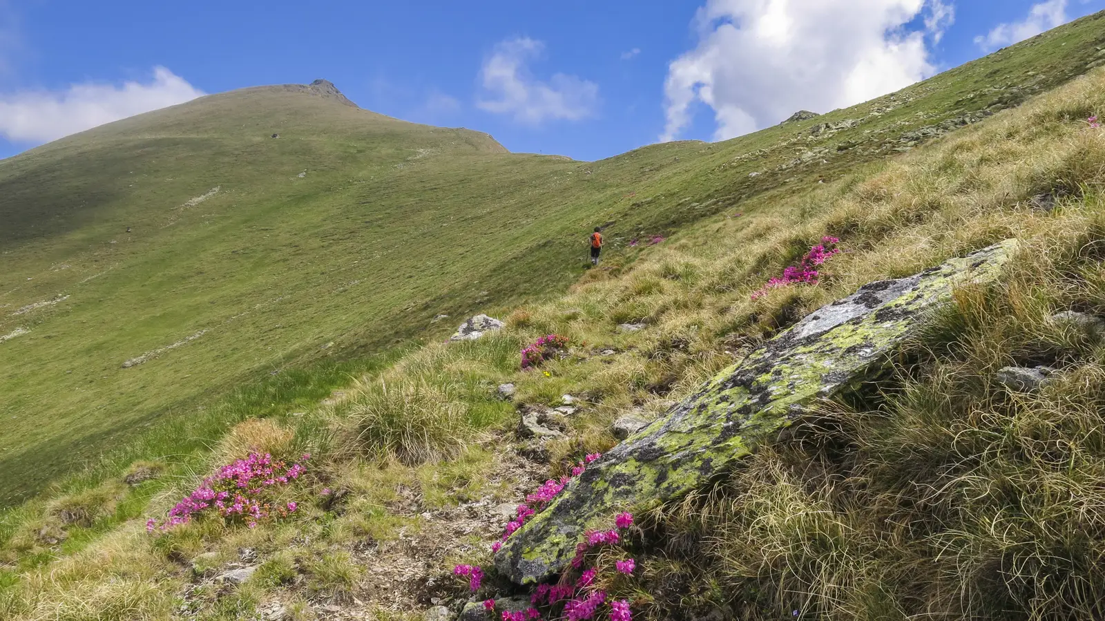 Din centrul localităţii Rodna, facem stânga spre drumul de Valea Vinului. În doar câtiva zeci de metri ajungem la un indicator cu săgeata care ne indică intrarea propriu zisă pe traseul marcat cu PA. Cotim dreapta pe ulicioara Ineu, printre gospodării, iar după ultimele case urcuşul se accentuează. Marcajul nu foarte des ne poartă printr-un pâlc de brazi, unde două-trei drumuri de căruţă se intersectează. Îl ţinem pe cel ce se îndreaptă spre nord şi apoi facem dreapta urcând pe singurul drum ce duce spre păşune. Odată ajunşi în păşune vom continua urcuşul spre est, iar când ajungem în drept cu Vf. Lazului, ne vom muta pe versantul estic. Noul drum (apărut în ultimii doi ani) a luat locul fostei poteci. Chiar şi aşa traseul şi-a păstrat din pitorescul de altădată, purtându-ne printre sălaşe şi fânaţe care ne aduc aminte de Apuseni. Marcajul PA nu e prea des, însă orientându-ne puţin, nu ar trebui să apară probleme. După circa 1 oră 45 de minute, trecem pe lângă un izvor (halău) şi în câteva minute drumul se duce spre o şa, foarte aproape de o stână aflată chiar în buza muntelui. Pentru a ocoli următorul vârf - Capu Beneşului (1587 m), vom trece pe partea vestică a versantului, unde vom continua pe curbă de nivel. Marcajul e destul de rar pe aici, apar diverse intersecţii cu alte drumuri însă confirmarea că am ales drumul bun, vine doar după câteva sute de metri. La un moment dat trecem pe lângă un izvor amenajat. Când ieşim din pădure ajungem din nou într-o şa. Acum drumul de pământ dispare, în dreapta rămâne Vf. Capu Beneşului, iar noi ne mutăm pe partea estică a muntelui. Reintrăm în pădure, urmăm drumul vreme de 15 minute, pentru ca mai apoi acesta să ne poarte pe lângă un adăpost ce aparţine de o stână, facem uşor spre stânga şi ieşim în culme. Vedem diverse drumuri înspre dreapta (nord-est) dar noi ţinem culmea şi după 20 minute intersectăm marcajul TR ce vine dinspre Izvorul Băilor (Valea Vinului). De la aceasta intersecţie, în care se află şi un pilon cu săgeţi, în doar 5 minute ajungem la Refugiul Salvamont Curăţel. Din Şaua Curăţel, pe curbă de nivel după 2-3 minute putem ajunge la un alt izvor (aflat înspre nord-vest). De la Refugiul Salvamont Curăţel aflat în şaua omonimă, mai avem de urcat aproximativ 2 ore până în Şaua cu Lac. Prin urmare, refugiul rămâne în urmă şi noi vom continua destul de pieptiş pe pajiştea înierbată şi nu spre drumul care o ia înspre dreapta. Pe această porţiune marcajul PA e ceva mai rar, apoi însă poteca marcată e însoţită constant de marcaj. Timp de jumătate de oră aceasta ne propune un traseu pe versantul estic. Când ne scoate într-o şa, o zonă ceva mai stâncoasă, frumos punct de belvedere, continuăm pe partea vestică a Muntelui Curăţel. Încă 1 h şi 15 min/ 1 h 1/2 continuăm urcuşul pe curbă de nivel până în Şaua cu Lac. Şaua este marcată prin prezenţa unui stâlp cu săgeţi, semn că am ajuns în creasta principală.