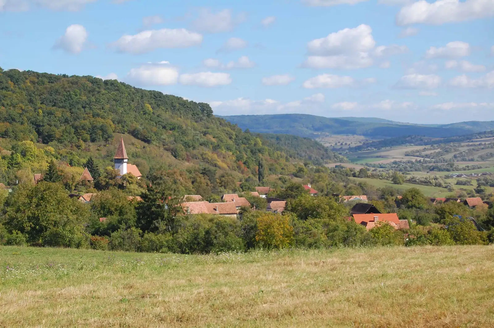 Traseul foloseşte unele din rutele concursului TBT Race. Urcăm pe deal, trecem pe la Cetatea Țărănească, apoi urmăm un parcurs prin pădure, în general aproape de culmea dealului. Ieşim la o intersecţie importantă de trasee. De aici intrăm pe poteca specială de biciclete, pietruită şi marcată cu BR, ce leagă Sighişoara de Viscri. Urmăm această potecă - pe care e o plăcere să pedalezi - cale de 5,7km preponderent prin pădure, apoi marcajul BR foloseşte un drum forestier pietruit 1,4 km, apoi din nou urmăm poteca aproape 6 km până la un indicator de lemn cu satele în care putem coborî. Aici sunt două variante - prima este să continu ăm spre Viscri încă 250m, apoi să coborâm în Meşendorf folosind un drum marcat cu CR. A doua variantă este să urmăm marcajele de concurs şi să ţinem culmea secundară (interfl uviul dintre Valea Daia şi Valea Morii) pentru o coborâre directă la Criţ. Atenţie, concursul coboară la Meşendorf, apoi urcă din nou pe culmea precizată, folosind o potecă în serpentine pietruită. Urmăm deci această potecă spre Criţ, însă pe ultima porţiune (la păşune) este neclară, aşa că folosim un drum de pământ şi coborâm la marginea satului Criţ. Străbatem localitatea, trecem dealul la Cloaşterf, de unde ne întoarcem la Saschiz pe DC53C asfaltat.
