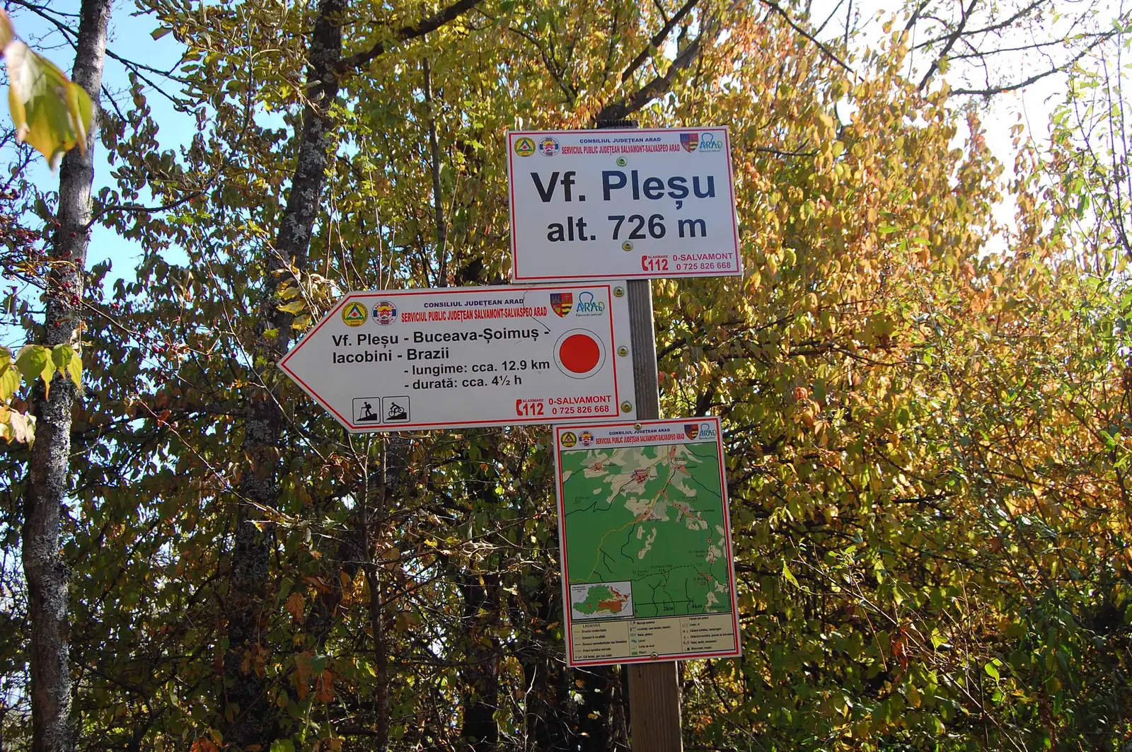 Traseul pleacă din DJ708, de la intersecția spre localitatea Brazii. La început, traseul urmărește drumuri locale, unele asfaltate, având un parcurs în zig-zag, însă cu bune semnalizări la intersecții. Străbatem o zonă de luncă, fără urcări mari, trecând prin localitatea Brazii, apoi pe la marginea localității Iacobini, urmează o plimbare de-a lungul pârâului și apoi intrăm în localitatea Buceava. De aici începem urcarea pe drumul asfaltat spre Șoimuș. Întâlnim un loc de popas frumos amenajat, aflat lângă un izvor puternic, cu apă foarte bună. Puțin mai sus este tabla de intrare în localitatea Șoimuș, iar spre stânga un drumeag urcă la o biserică de lemn din sec. XVIII cu hramul sf. Dumitru. Continuăm urcarea pe drumul asfaltat, străbatem în totalitate localitatea Șoimuș, după care continuăm în aceeași direcție pe drumul forestier. Până unde se termină asfaltul sunt 7km de la DJ708. Urcăm pe drumeagul care urmărește o culme secundară prin pășunea întreruptă de pâlcuri de copaci sau arbuști. Nu putem să nu admirăm gorunii maiestoși care străjuiesc drumul. După mai bine de 3km de la finalul asfaltului urcușul se termină deocamdată și urmează un parcurs preponderent în coborâre ușoară, drumeagul ocolind prin stânga (est) Vârful Fântâna lui Șarpe. Poposim la un izvor amenajat aflat lângă o stână, apoi intrăm în pădure. La un moment dat trebuie să fim atenți pentru că marcajul părăsește drumul pentru o potecă spre stânga, care iese într-o poiană. Poteca se transformă curând în drum și din nou intrăm în pădurea compactă, unde după ce trecem un vârf mai mic și coborâm într-o șa împădurită, ne angajăm într-un ultim urcuș destul de abrupt. Ieșim în creasta principală unde întâlnim un stâlp indicator, de unde alături de traseul BR în mai puțin de 500 m atingem Vf. Pleșu, finalul traseului.