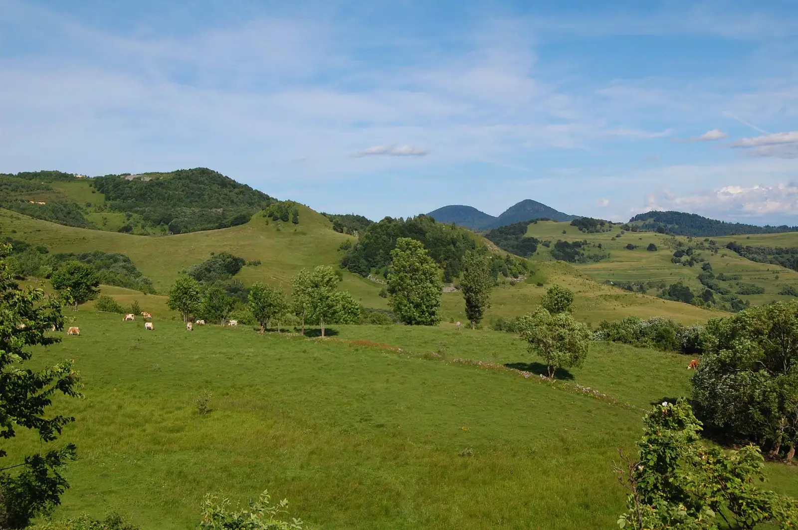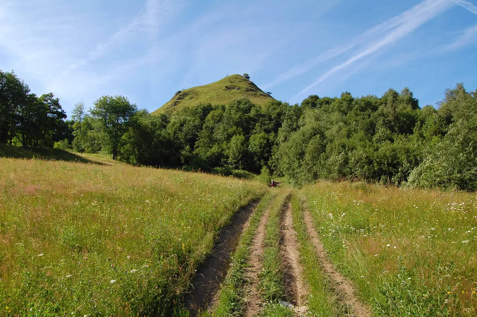 Ghidați de un indicator pătrundem în cimitirul din Bucium pe care-l străbatem în urcare pe o cărare. Ieșim apoi într-un drum care vine din dreapta și se înscrie pe coama dealului. Urmăm acest drum în urcare mai bine de 1 km și poposim la … Popasul Fefeleaga. La 400 m mai sus întâlnim drumul asfaltat care vine din Bucium, pe care urcăm până la finalul lui doar 50m. După încă 500 m întâlnim indicatorul pentru traseul Circuitul Detunatei Goale, cu marcaj PR. Aici cotim ușor stânga și împreună cu ramura din stânga a circuitului intrăm în pădure, iar într-o poiană un stâlp cu marcaj ne anunță că până pe Detunata Goală este un urcuș de numai 10 minute (pe marcaj PR). Noi continuăm însă în aceeași direcție, apoi cotim ușor stânga (nord). Spre dreapta observăm două vârfuri gemene, împădurite, un excelent punct de reper. Urmează un frumos parcurs fără diferențe mari de nivel prin poieni pitorești întrerupte de mici pâlcuri de pădure folosind drumurile din zonă. După mai bine de 2 km parcurși în această manieră întâlnim un drum mai serios care vine dinspre dreapta (est) și schimbăm direcția spre stânga (vest). În față “admirăm” cariera de la Roșia Poieni iar spre dreapta celebrul lac de decantare Valea Şesii cu biserica înecată. Un indicator ne abate de la direcția vest și ne îndeamnă să coborâm pe un drumeag tăiat în coasta muntelui în satul Poiana, unde găsim apă potabilă. Urmează cătunul Muntari, pe ulițele căruia începem urcușul care se va termina în drumul asfaltat ce vine din Valea Corna, unde se află un stâlp indicator cu săgeți. Travesăm acest drum păstrând direcția și coborâm pe un drumeag la Tăul Mare, împreună cu traseul PR. Înconjurăm tăul pe drum prin dreapta (nord și vest), trecem stăvilarul acestuia (aflat în colțul din sud-vest) și imediat cotim dreapta angajându-ne din nou în coborâre pe un drumeag, printr-o zonă cu vegetație bogată. Traseul PR ne părăsește vremelnic spre dreapta, însă îl vom reîntâlni mai jos, după ce trecem pe lângă primele case din Roșia Montană. Suntem deci pe o uliță a localității, care coboară în drumul asfaltat. Pe acest drum în aproximativ 350 m ajungem în Piața Centrală, loc din care pleacă mai multe trasee turistice.