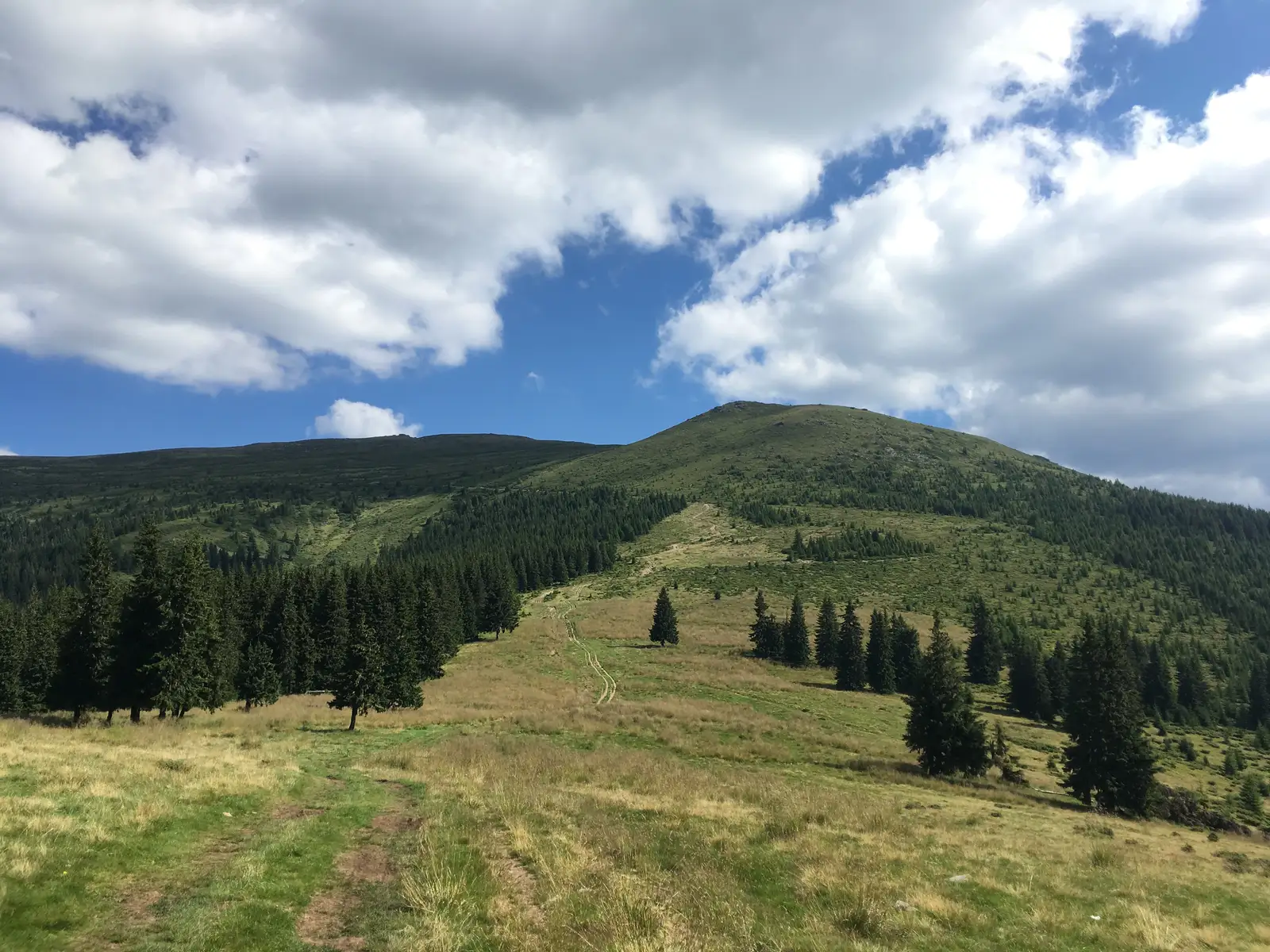 Noi cotim la dreapta și urcăm destul de aprig, prin jnepeniș până pe Vf. Cindrel, marcat cu troițe, cel mai înalt din masiv, deasupra fermecătorului lac glaciar Iezerul Mare, aflat într-o superbă căldare sub vârf, supranumit „marea de smarald”, datorită culorii.