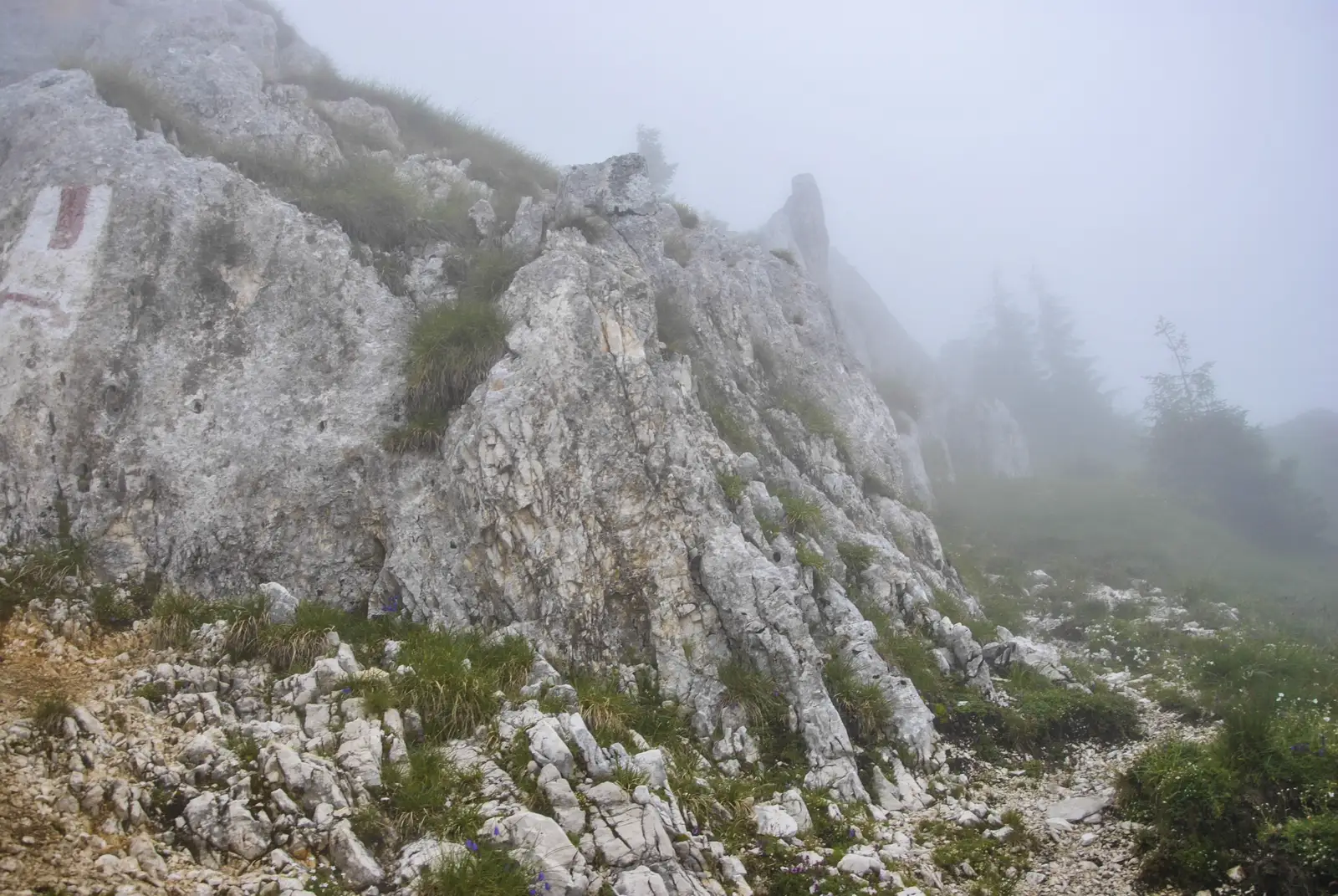 Traseu omologat. Inaccesibil iarna între Vf. La Om şi ref. Grind 1 (variantă nemarcată pe Colţii Găinii)
