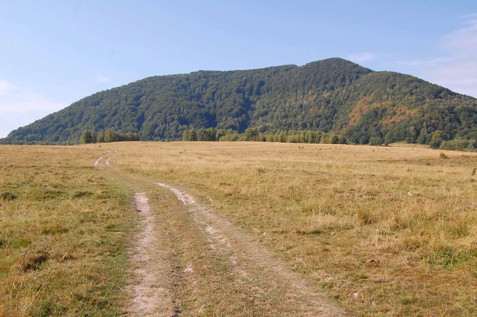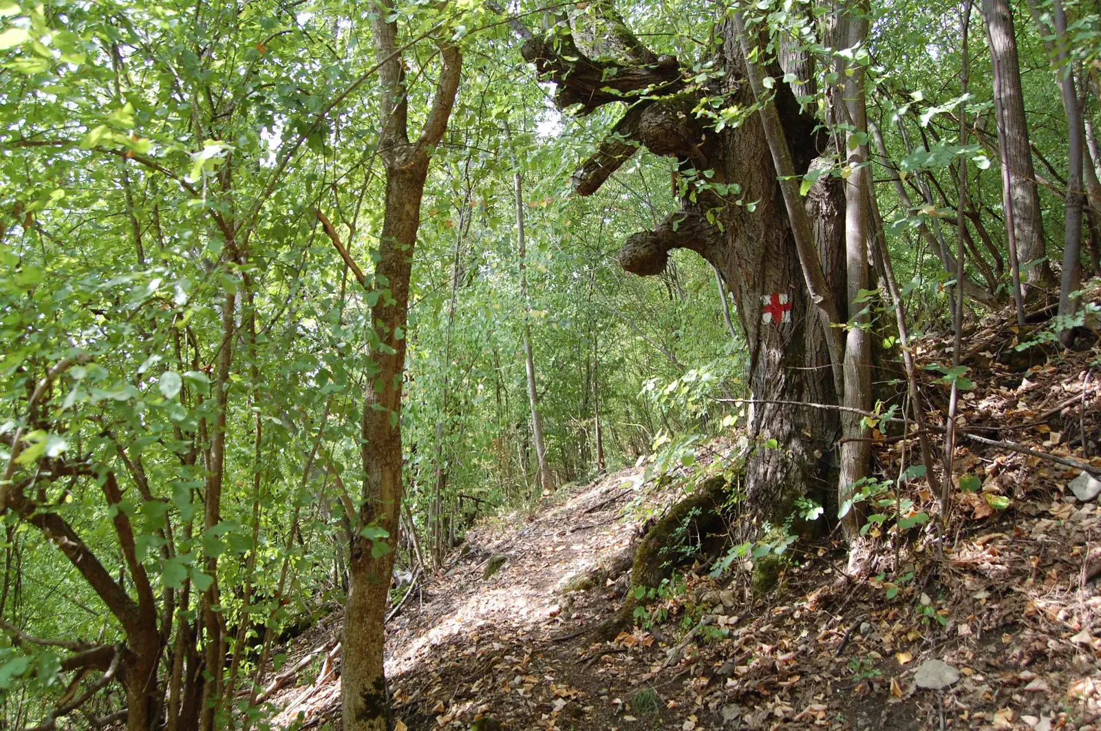 Traseul pleacă chiar din centrul orașului Zlatna, urmărind strada Decebal spre sud. Trecem calea ferată, Ampoiul și șoseaua de centură, apoi ne înscriem în urcare pe strada pavată Vasile Alecsandri, printr-un mic cartier de case modeste. Și după ieșirea din oraș continuăm să urcăm pe drumeagul abrupt, presărat cu troițe numerotate, simbolizând „Drumul Crucii” - cele 14 opriri ale lui Isus. La un moment dat marcajul și calea creștină părăsesc drumeagul săpat în solul roșiatic pentru o potecă spre dreapta, prin pădure. Trecem pe lângă o gospodărie izolată, reîntâlnim drumul și ieșim la pășune, unde semnele sunt rare dar drumeagul este clar. Un indicator turistic ne invită să cotim ușor dreapta și să intrăm din nou în pădurea de foioase. Trecem de un pârâu, apoi poieni, din nou pădure și chiar înainte de ultima urcare întâlnim un izvor străjuit de un pâlc de copaci. Această ultimă urcare abruptă printr-o zonă de pășune nu este bine marcată, dar nu este greu să nimerim ieșirea în culme, într-o șa cu o cruce de lemn, ultimul loc de unde se mai vede Zlatna cu turnul ei inconfundabil. Traversăm drumul de culme care duce la carierele ce mușcă din dealurile aflate în dreapta (vest) și stânga noastră (est) și păstrăm direcția sud pe un drumeag care coboară pe o culme secundară. Trecem prin două pâlcuri de pădure, apoi drumul intră într-o pădure mai serioasă prin care coboară abrupt, până întâlnește prima casă din satul Cib, jos în vale. Marcajul traversează întreaga localitate și continuă în satul Cheile Cibului, mai bine de 4 km pe drumul parțial asfaltat. Aici, ghidați de un indicator trecem pârâul prin vad pe un drumeag care se apropie de pereții versantului drept al Cheilor Cibului. Ajungem într-o poiană cu o mică grădină și o fântână cu cumpănă, ultima urmă a satului, de unde urmăm poteca ce ne urcă într-un loc de belvedere, deasupra văii. Aici este un punct ceva mai dificil, dotat cu niște scări de lemn care ne ajută să coborâm la baza unui perete de stâncă vertical. Traversăm un mic grohotiș, apoi urmăm poteca tăiată în culmea dealului prin pădurea tânără care se îndesește tot mai mult și se transformă într-o zonă cu tufișuri enervante. După ceva senzații neplăcute ieșim în sfârșit la pășune unde imediat cotim stânga (sud) și coborâm la o șa unde în 2012 s-a construit o cruce mare de lemn. Aici schimbăm din nou direcția spre dreapta (vest), trecem pe lângă un izvor amenajat pentru animale, apoi întâlnim un drumeag pe care coborâm până în satul Ardeu, lângă podul peste pârâul omonim. Marcajul urmărește DJ705 în aval circa 1 km, apoi un indicator ne invită să trecem pârâul și să începem din nou urcarea prin pădure. Folosim un drum forestier, care în 1,3 km ne ridică în culmea dealului (160m), unde pădurea lasă loc pășunii și tufișurilor. Coborâm în satul Mada tot pe un drumeag local, care trece prin livezi abandonate, urmărind oarecum linia stâlpilor de electricitate. După ce trecem puntea peste pârâul Geoagiu și ieșim la asfalt, nu continuăm drumul spre cheile Madei, ci cotim brusc stânga pe un drum paralel cu o vale secundară. Ieșim din localitate urmând acest drum și după 2 km intrăm în cătunul răsfirat Stăuini. Aici, la o intersecție de drumuri schimbăm total direcția apucând pe un drumeag ce urcă ocolit pe dealul dinspre nord. Sus mai întâlnim niște gospodării izolate, admirăm Cheile Madei de sus și revenim la direcția inițială într-o curbă strânsă a drumului. Ne instalăm așadar pe culmea dealului pe care o urmăm 3,5 km de aici. Mai trecem pe lângă niște case izolate, cu livezi de pruni, apoi întâlnim o cruce veche de piatră erodată de vremuri și o stână. Drumul străbate pășunea întreruptă de pâlcuri de mesteceni, iar când ne apropiem de Măgurile Săcărâmbului, împădurite dar abrupte spre direcția noastră, cotim ușor stânga pentru a le ocoli. Traversăm un mic pârâu străjuit de pădure, apoi un pâlc de pădure mai serios și ieșim din nou la pășune. Sus aproape de culme, unde cotim stânga (sud-est) folosind o scurtătură, întâlnim un drum mai serios străjuit de stâlpi de electricitate, pe care-i vom urma mult timp de acum încolo. Trecem printr-o succesiune de păduri întrerupte de poieni sau de linia stâlpilor, cale de 4,5 km. Întâlnim pâlcuri de molizi în pădurea de fag sau o zonă cu carpeni multipli, mai mulți copaci din aceeași rădăcină. Ieșim în final într-o poiană mare unde linia stâlpilor se împarte în forma literei T, una merge tot înainte spre vf. Măgura Boiului unde este construit un releu de televiziune, iar alta coboară spre stânga la Geoagiu Băi. O urmărim pe ultima traversând pășunea cu fagi mari și rari, trecem pe lângă un saivan, apoi pe lângă o stână foarte bine gospodărită. La un moment dat părăsim linia stâlpilor spre stânga, însă îi regăsim după circa 650 m. Din nou întâlnim o bifurcație de stâlpi (aici este și o troiță) , unde facem dreapta. Suntem de fapt pe DC30, care leagă satul Renghet de Geoagiu Băi. Traversăm în coborâre un pâlc de case (cătunul „După Deal”), apoi trecem valea Ceretului pe un pod și urcăm ușor în localitatea Geoagiu Băi, unde putem vizita Băile Romane, Cascada Clocota, Grota Haiducilor, etc.